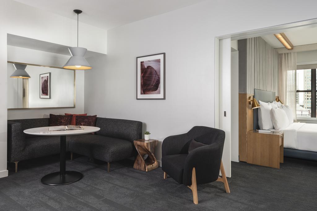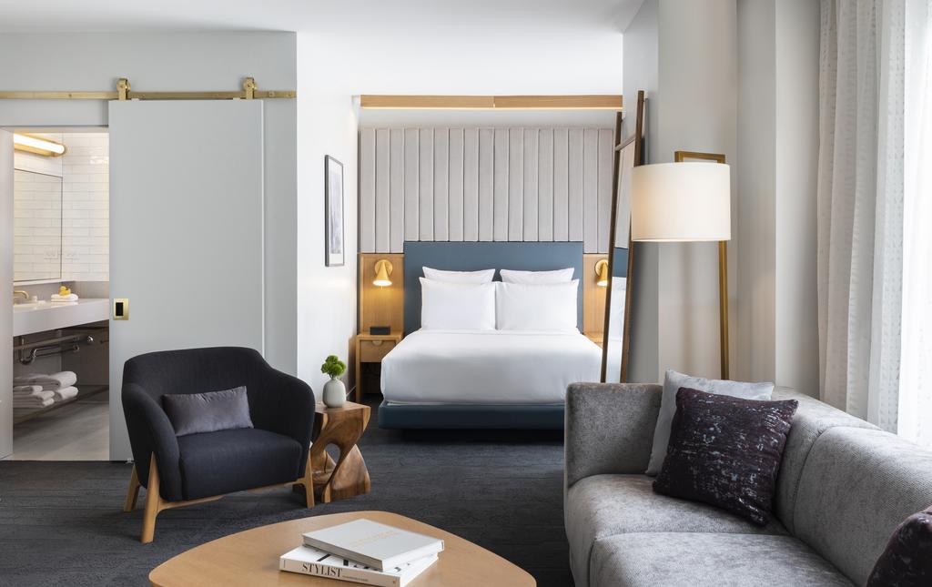 While the public spaces hum with visual energy, the guest rooms bring calm and comfort, offering stylish, modern interiors designed for rest after a day of gallery hopping or Chicago exploring. Subtle artistic elements carry into the private spaces, tying each room to the larger cultural narrative of the property.