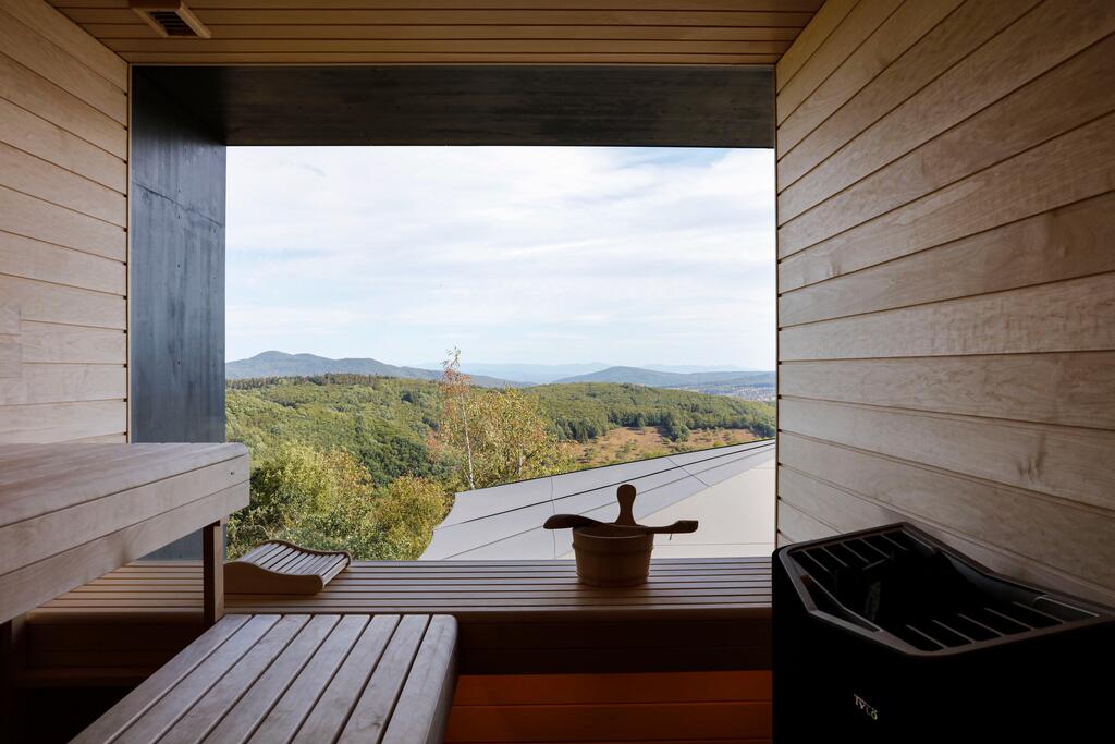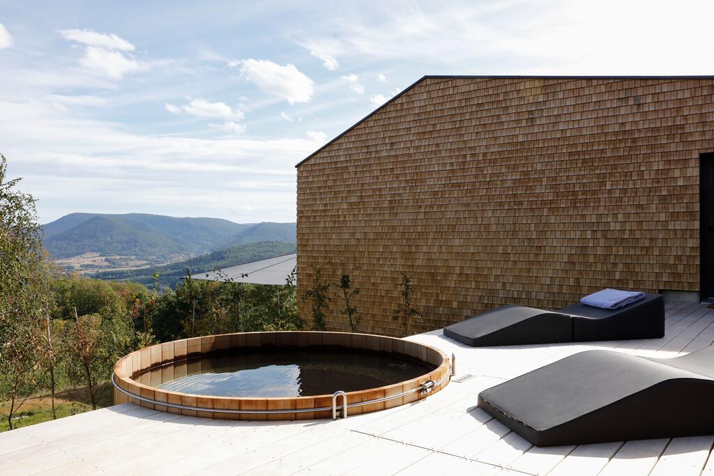 At the base of the hill, the main building houses the reception, spa, and restaurant, all showcasing natural materials and clean-lined Nordic design. Here, guests are immersed in a tactile palette of raw stone flooring, locally quarried sandstone, beeswax-treated timber, and linen-upholstered seating. The restaurant serves seasonal Alsatian cuisine, much of it grown on-site or sourced from nearby organic farms. A herbalist’s apothecary complements the spa, offering botanical teas and infusions inspired by the surrounding hills.
