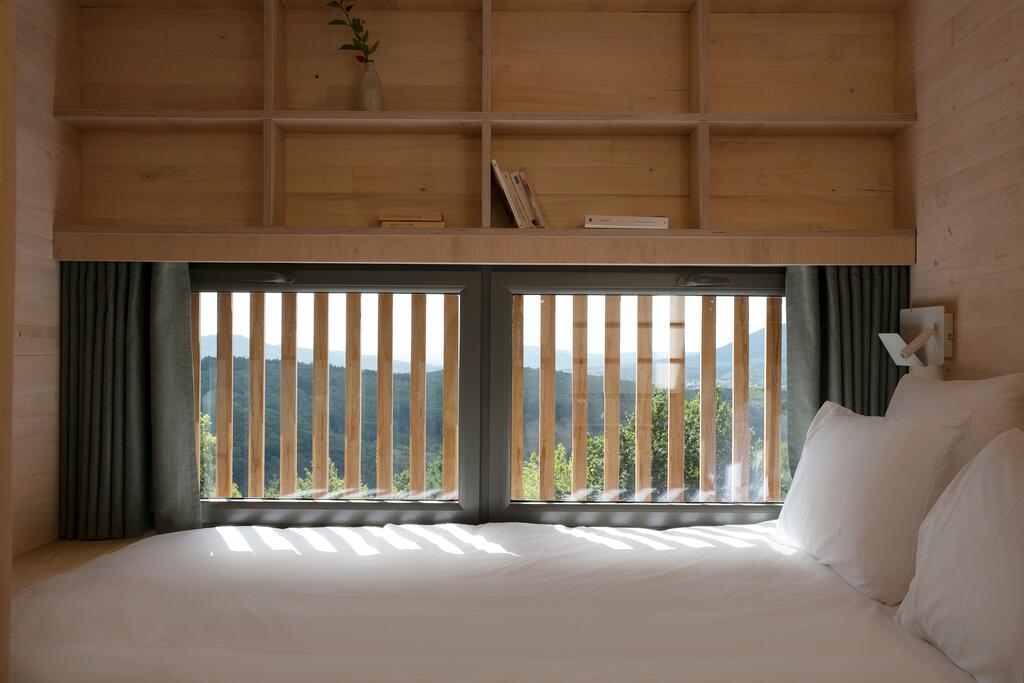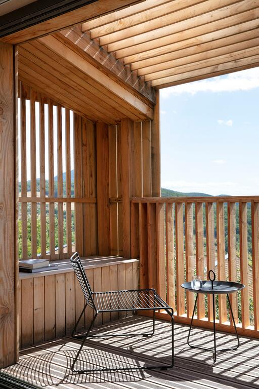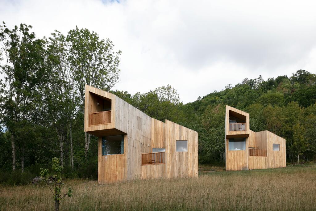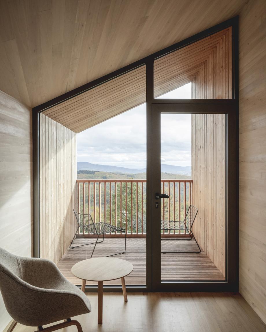 All feature local chestnut cladding that will weather naturally over time, paired with insulated timber frames, green roofs, and expansive glazing to blur the line between indoors and out. Interiors are calm and textural, using oak joinery, handwoven wool textiles, limed plaster walls, and bespoke furniture crafted by Alsatian artisans.