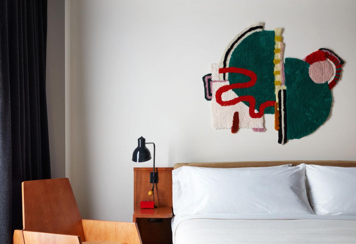 The lobby hums with Brooklyn energy—part design museum, part writers’ lounge. Think custom and vintage furniture, a bar wrapped in a sculpture by Verdan Jakšić, and abstract linework by Tara Geer. Art isn’t an afterthought; there’s a dedicated gallery space, and it shows. Upstairs, the 287 guest rooms are Brooklyn loft meets European modernist studio, with concrete ceilings, tactile materials, and textiles by local artists. It’s rugged, warm, and thoughtful—Ace’s calling card, but reimagined with borough grit and global edge.