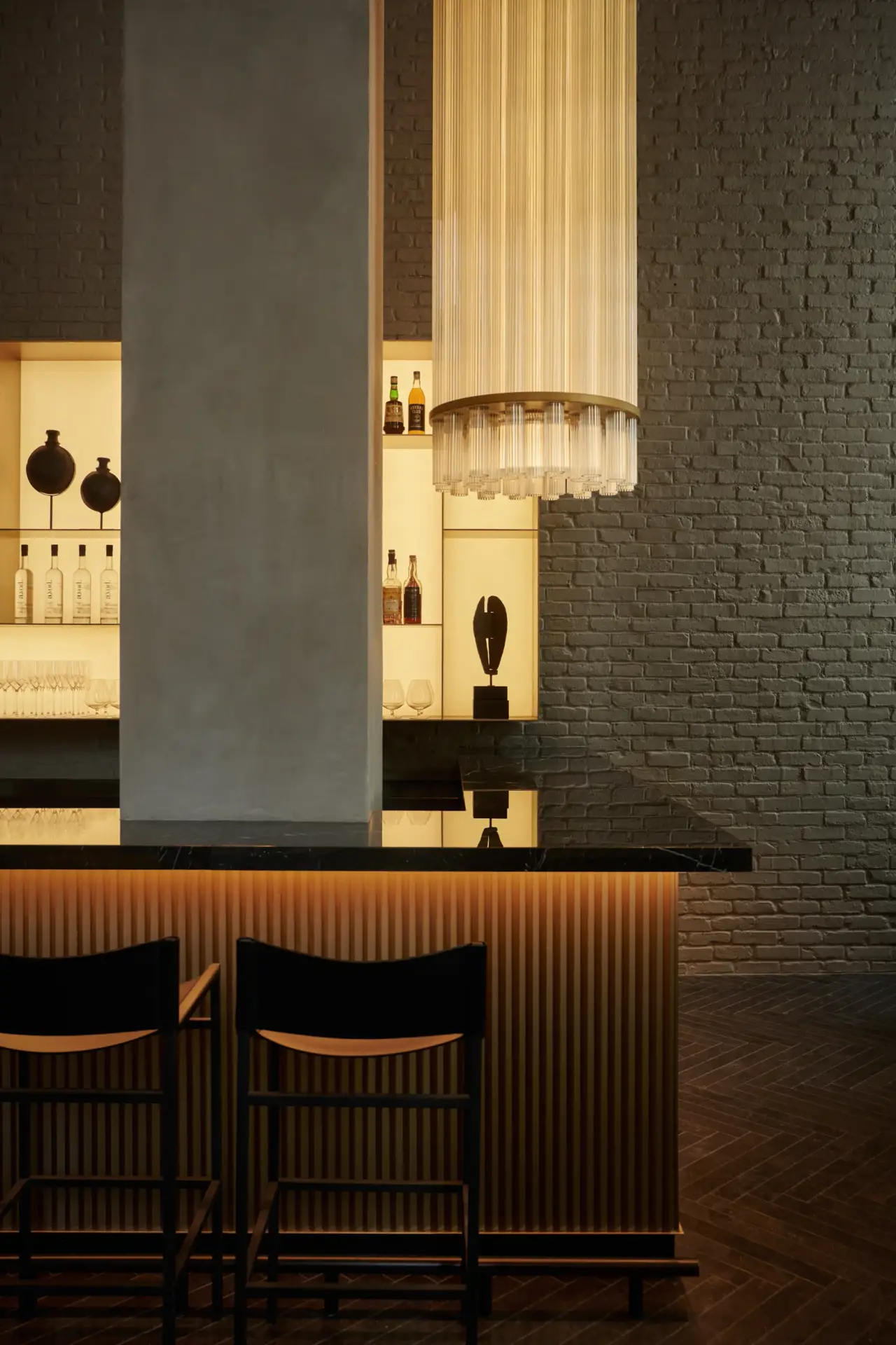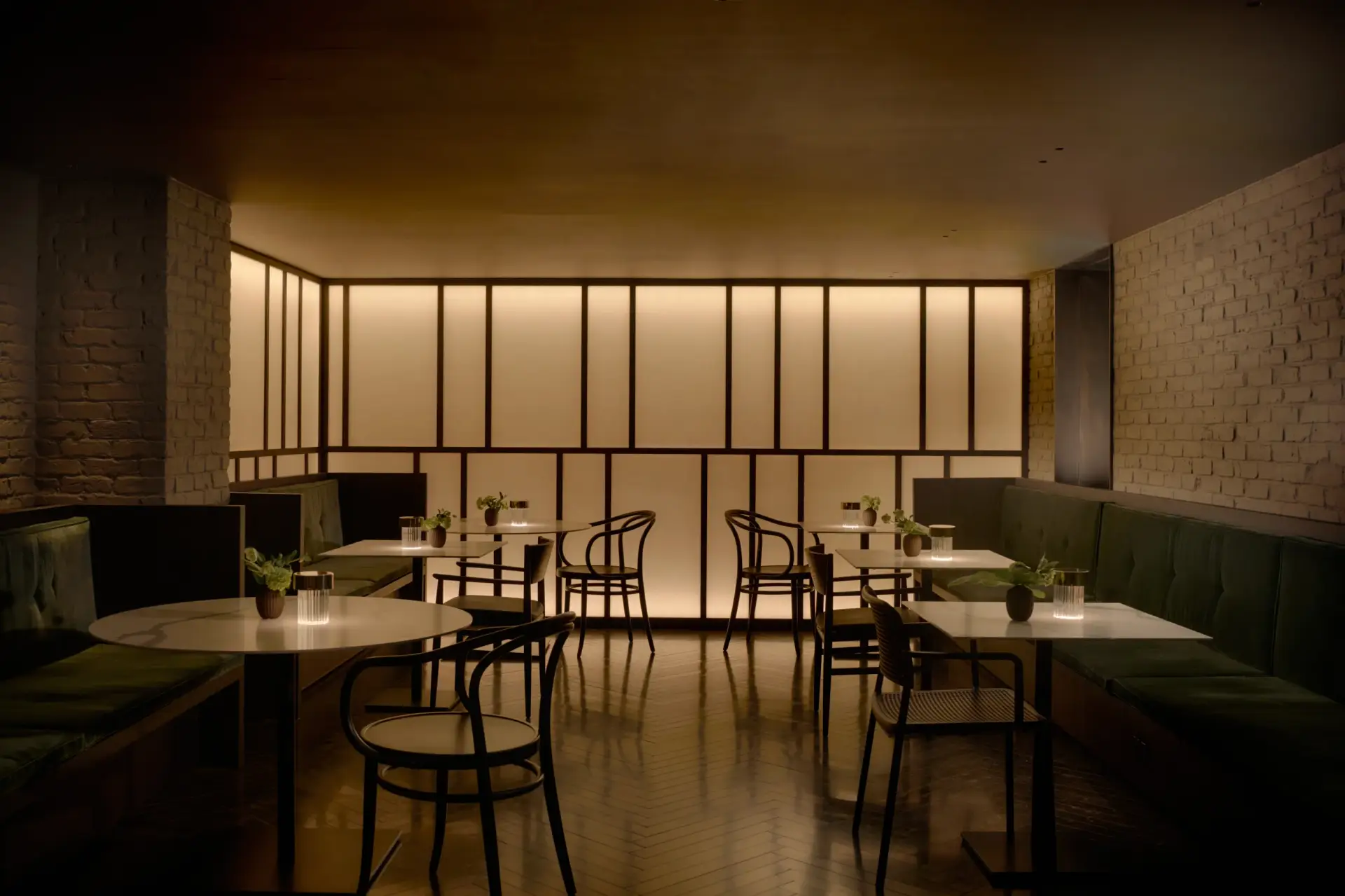 The interiors speak in a low voice—but say a lot. AKA NoMad’s double-height lobby greets guests with a spiraling bronze staircase and a curated interplay of herringbone stone floors, exposed brick, and soft neutrals. It’s a visual dialogue between Japanese simplicity and New York architectural heritage, softened by plush textiles, layered lighting, and subtle gold and green accents. Tucked behind a shoji screen in the lobby, the cocktail bar offers an intimate, speakeasy-style setting for some of the city’s most considered drinks. It’s quiet luxury without pretense—just thoughtful space, designed for restoration.