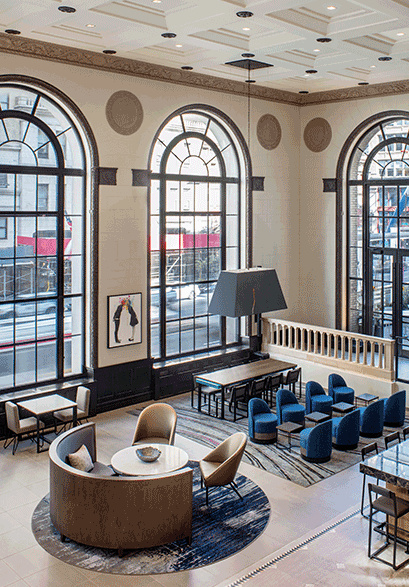 In the beating heart of Center City—where historic grit collides with contemporary momentum—Aloft Philadelphia Downtown proves that the past isn’t meant to be polished away; it’s meant to be reimagined. Housed within the former Liberty Title & Trust Building (1925), this striking property is a masterclass in adaptive reuse, where architectural grandeur and street-level attitude share the same stage. When the team at Stonehill Taylor first walked into the derelict structure, it was a ghost of its former self: dust-caked marble, rusting fixtures, and graffiti stretching across forgotten walls. But rather than erase that layered history, they built upon it. Today, the hotel’s double-height lobby—framed by original marble balustrades, arched windows, and a meticulously restored clock—is a living dialogue between then and now. It’s part cathedral, part gallery, part urban playground.