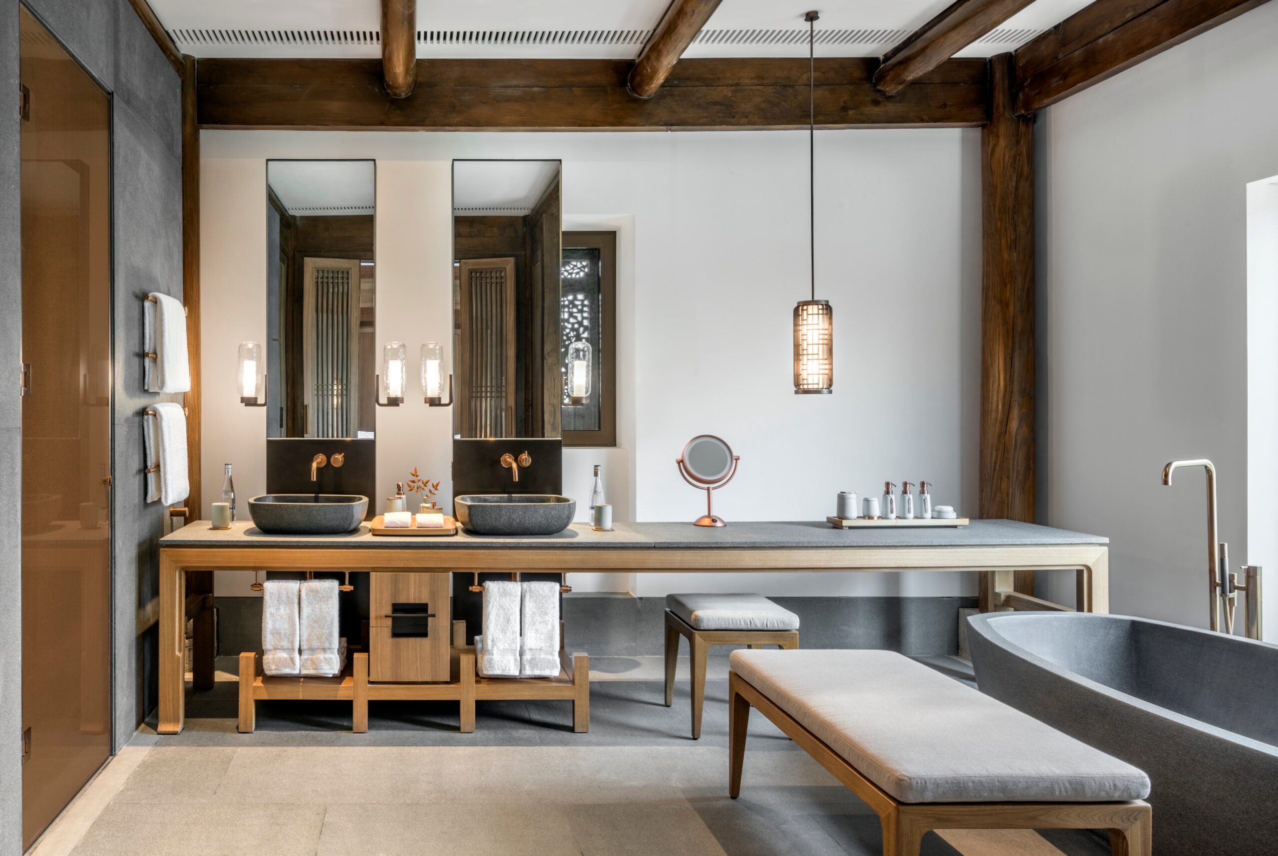 To walk through Amanyangyun is to enter a reconstructed dream of ancient China. The relocated camphor forest envelops the resort, its dappled light and musky scent grounding everything in a deep sense of time. Within it, the reassembled antique houses—each a piece of living history—have been transformed into guest villas that blend classical craftsmanship with Aman’s signature minimalist refinement. Think hand-carved wooden beams, original stonework, and hushed courtyards—now paired with discreet plunge pools, floor-to-ceiling glass, and interiors so serene they border on spiritual.