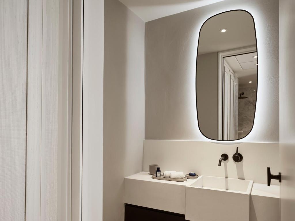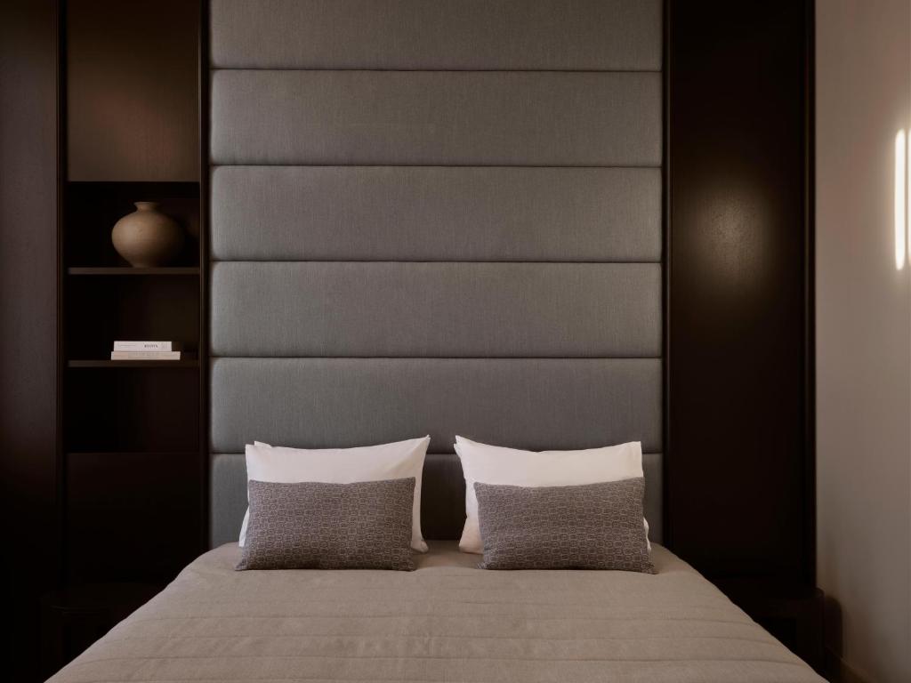 Inside, the design is guided by texture and tone. Oak and iroko wood, bronze, stone, leather, and silk create a palette that is warm, grounded, and quietly luxurious. Rooms are airy and minimal, with high ceilings and blue-shuttered windows framing the Cypriot sunlight. Some open onto private terraces, where the city reveals itself in layers—church bells, distant minarets, and terracotta rooftops stretching across the Old Town.