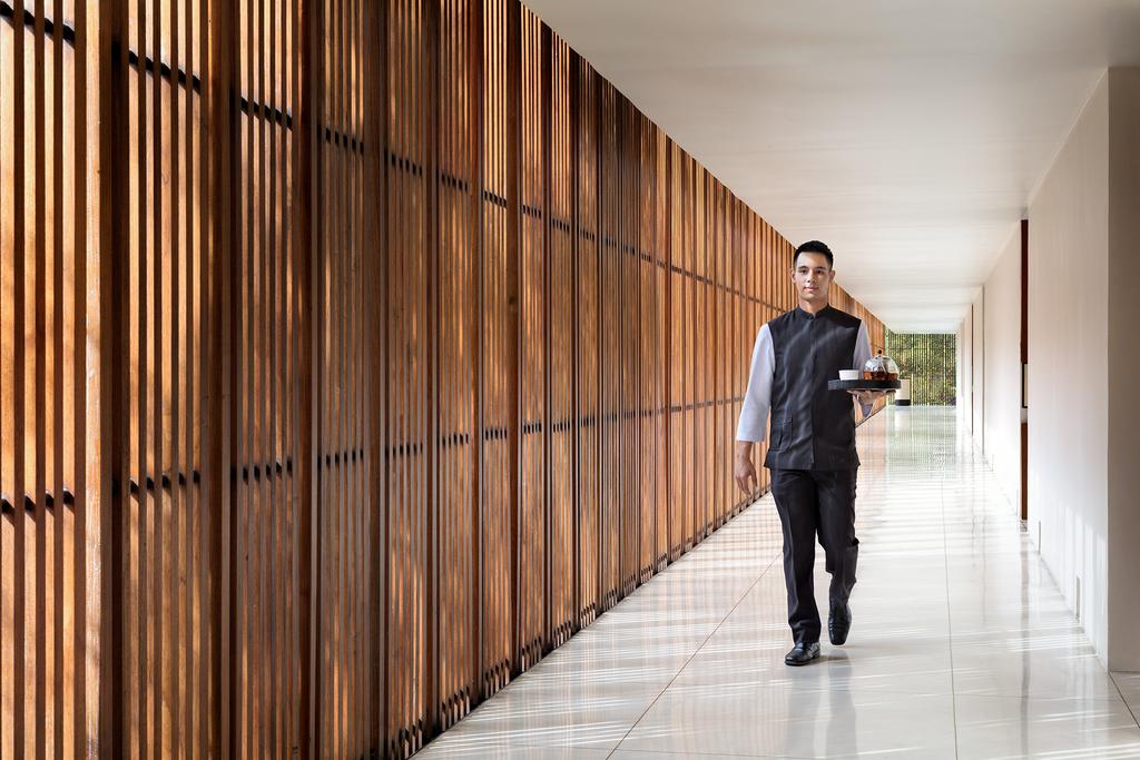 The 84 rooms and suites extend the resort’s architectural language of calm. Floor-to-ceiling windows dissolve the boundary between inside and out, opening to vistas of river or garden. Interiors are grounded in **natural materials—polished teak, silk textiles, woven bamboo, and handmade ceramics—**all rendered in a restrained palette of stone, sand, and wood. Each space invites stillness. There are no visual intrusions, only light, texture, and the sound of water.