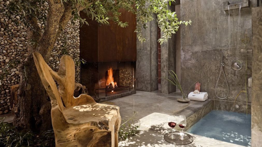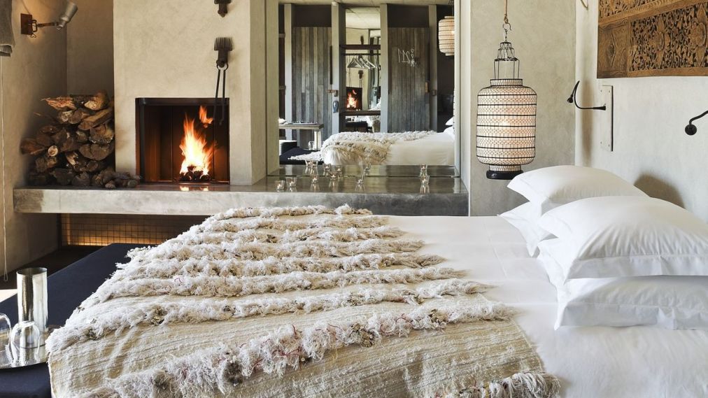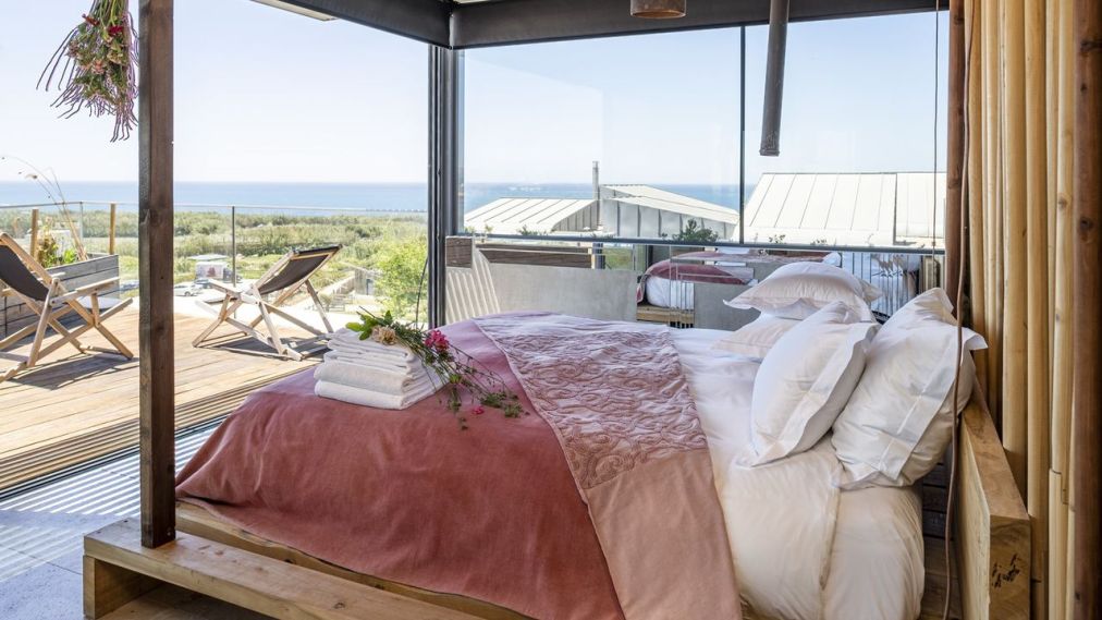 Each of the 16 individually designed rooms tells a different tale—of love, earth, sea, and time. No two are alike, yet all share the same elemental language: driftwood and stone, linen and light, iron and fire. Some rooms—like Nha Cretcheu (“My Beloved”)—exude pure romance, with four-poster beds, suspended stoves, and outdoor bathtubs under the stars. Others embrace bohemian spirit, mixing vibrant Moroccan tiles, rustic textures, and floor-to-ceiling glass that opens directly onto the dunes. The glamping tents, set apart from the main building, add a touch of wilderness luxury—canvas cocoons where you wake to birdsong and ocean air. For those seeking deeper solitude, the villas—newer additions to the property—extend the Areias philosophy into private sanctuaries. With space for up to six guests, each villa features an open-plan kitchen, outdoor barbecue, and private pool overlooking the Atlantic. It’s barefoot luxury at its most considered: sensual, sustainable, and slow.