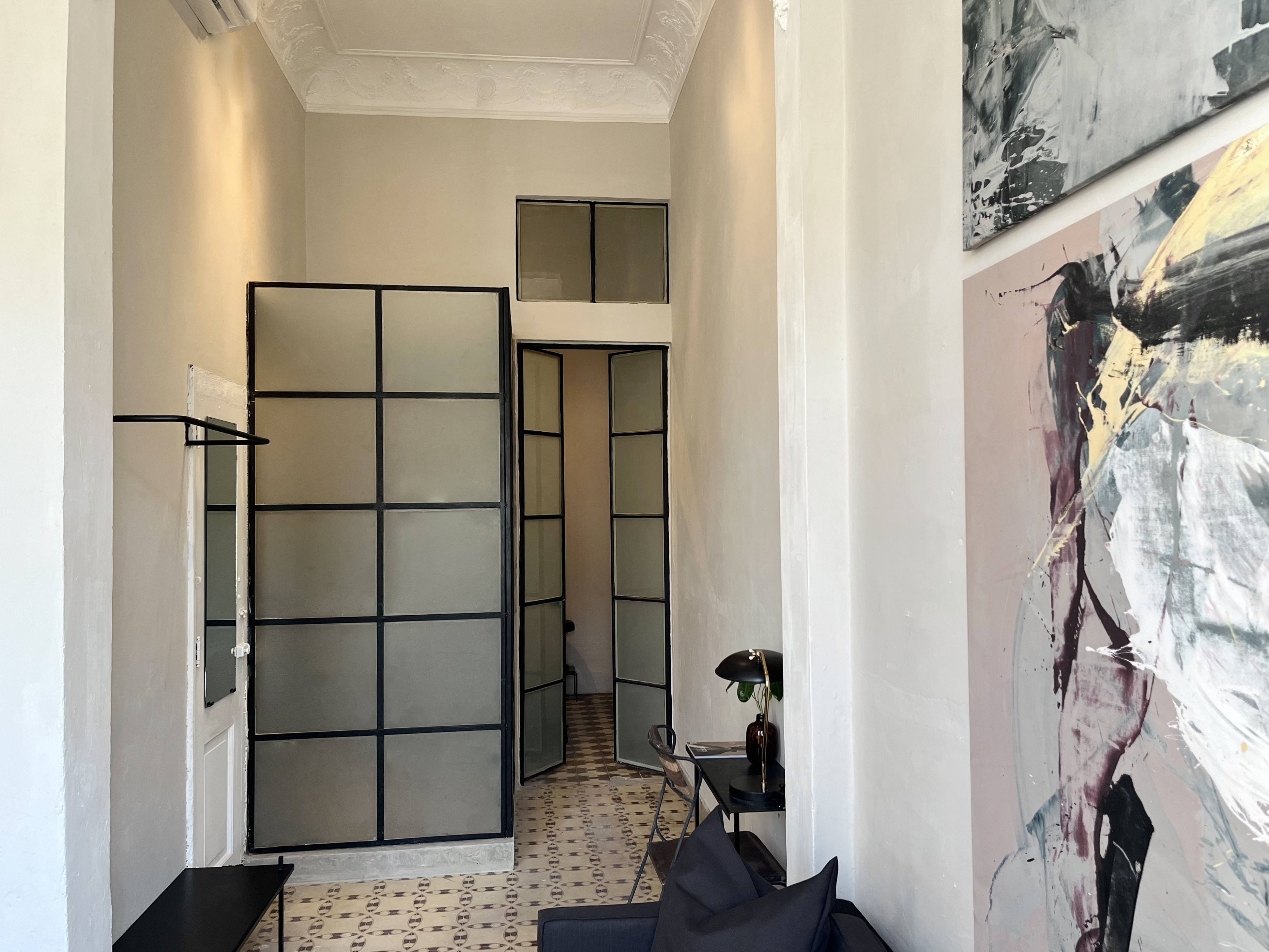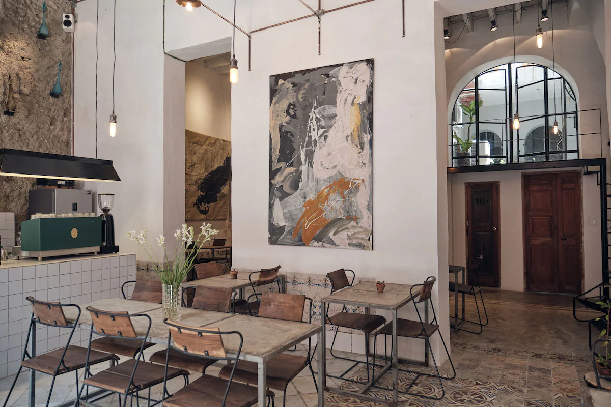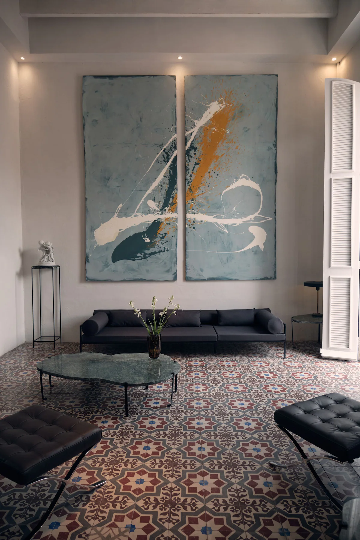 Inside, Mies van der Rohe’s Barcelona chairs rest beneath industrial lighting. Venetian glass vases add vintage texture, while Visser’s abstract works breathe color and movement into the space. The result is layered, refined, and unmistakably personal—part gallery, part home, all Havana.