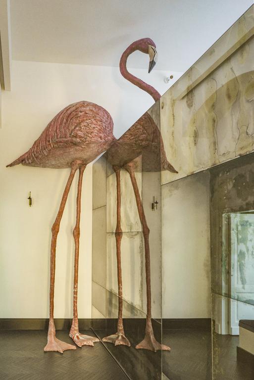 The journey begins in the grand entryway, where art greets you before words do. A mural of Billonia, the flower-bearing goddess of happiness, ushers guests into a world where whimsy replaces convention. Sculptures and surreal installations—like Domenico Pellegrino’s flamboyant pink flamingo, inspired by Catania’s Giardino Bellini—inject humor and wonder into the Baroque setting. Every surface holds intention. Frescoes ripple above contemporary art pieces; historic stucco and Sicilian ceramics find new conversation partners in neon light and brass. It’s anachronism made elegant, where eras merge seamlessly into narrative design.