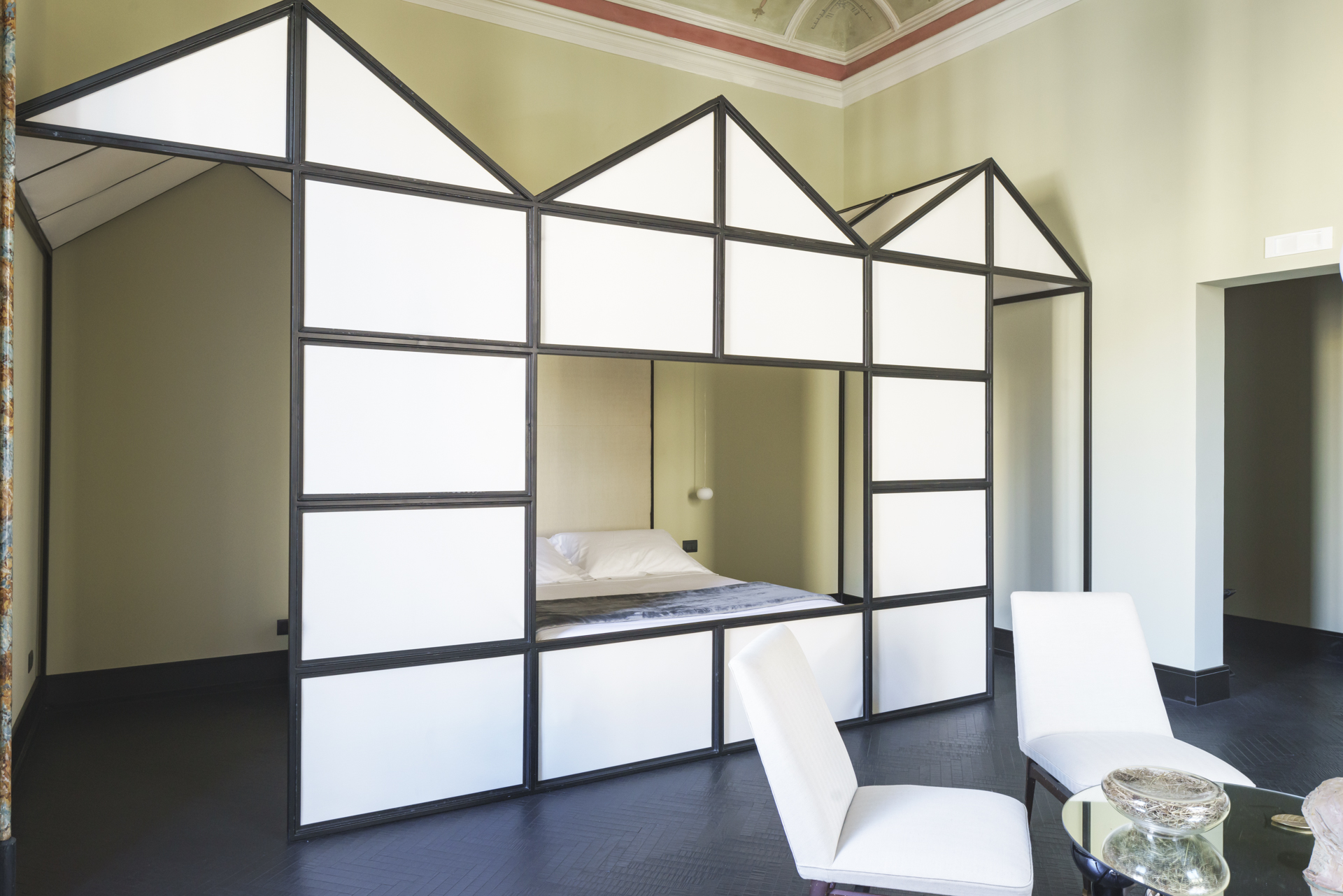 Aci & Galatea Room – Twin beds divided by emerald fabric pay poetic homage to star-crossed lovers turned into sea and stone.