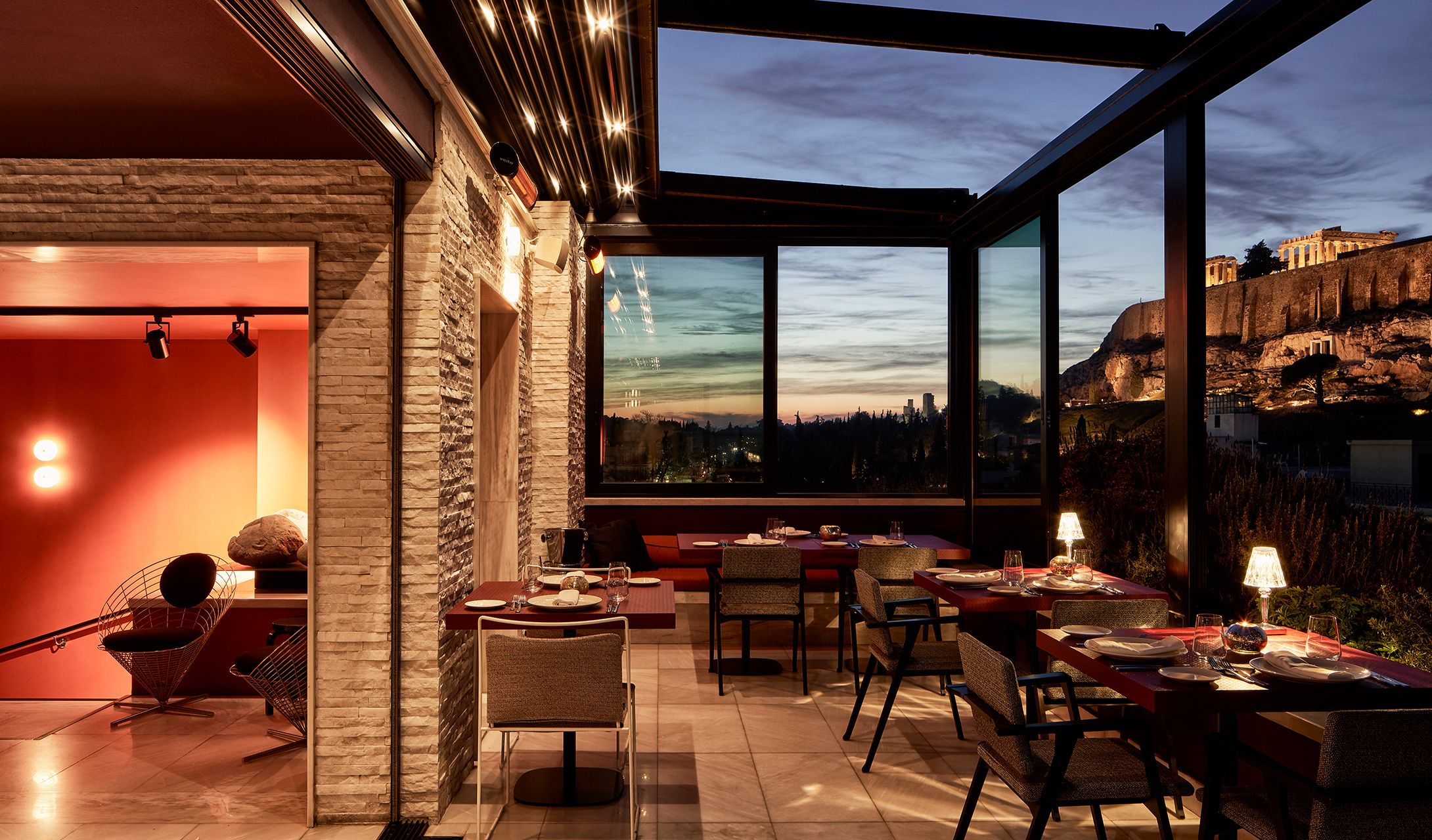 The hotel’s 21 rooms extend this ethos with warm woods, subtle art prints, and sleek lighting by Konstantin Grcic. Each one opens onto a private balcony, because in Athens, the outside matters as much as the in. Watch the city wake, watch it glow at sunset, or let it hum beneath you at night. For the ultimate view, climb to the rooftop: a single sweep of history unfolds—the Parthenon, the Temple of Olympian Zeus, the Old Olympic Stadium. It’s not just a terrace. It’s a time machine.