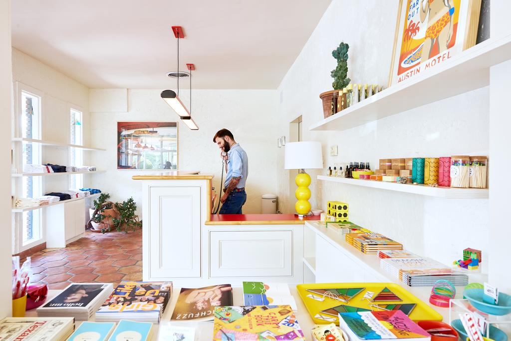 The lobby is anything but ordinary—it channels the casual charm of a neighborhood convenience store. Coolers are stocked with grab-and-go drinks and snacks, while a curated retail corner offers travel essentials, quirky souvenirs, and stylish poolside accessories. It’s practical, playful, and unmistakably Austin.