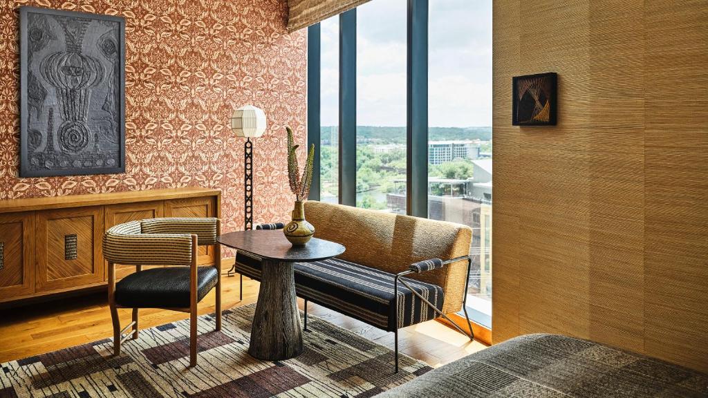 At street level, the restaurant and gathering spaces blur indoor and outdoor living. Graphite-gray panels and open sightlines connect guests directly to the energy of the Seaholm District, embedding the property into the rhythm of the neighborhood. The aesthetic is stylish, but never detached—it belongs to the city as much as to the brand.