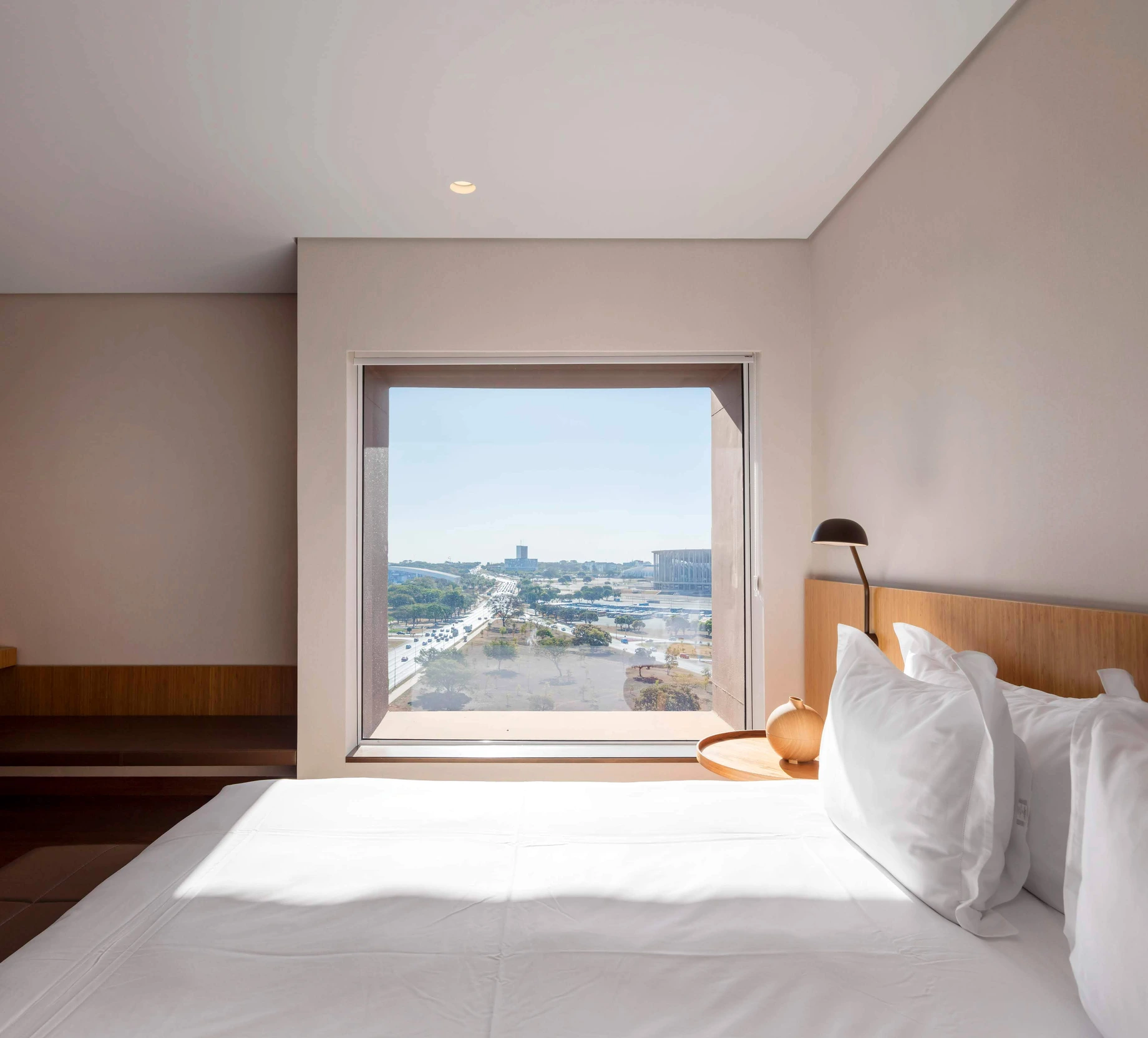 Some cities are shaped by architecture. Brasília is architecture. A planned utopia launched in 1960, Brazil’s capital is a geometric symphony of concrete, curves, and sky — where Niemeyer’s modernist dreams still hover in the heat, where urbanism becomes sculpture, and where the city’s Monumental Axis cuts through it all like a design manifesto. And at last, amid all this structural poetry, there’s a hotel that lives up to it: B Hotel Brasília, designed by Isay Weinfeld, Brazil’s minimalist master and the architect behind Fasano hotels and DNA Hotels favorite Square Nine in Belgrade. B Hotel stands apart — angular, golden, geometric — as if it were carved from Brasília’s architectural DNA. Its façade, with brise-soleil grids in golden anodized aluminum, reflects both sun and order. The form is monumental, but it doesn’t compete with Niemeyer’s icons — it adds a new voice to the skyline, one both modern and unmistakably Brazilian.