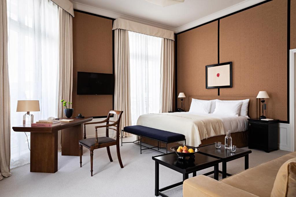 Communal spaces evoke the feel of a private residence rather than a hotel lobby. The glass‑domed lounge acts as a tranquil salon, while the bar pairs textured burlwood, mirrored tables, and atmospheric lighting with cocktails inspired by Balzac’s literary works, such as the signature “Comédie Humaine.”