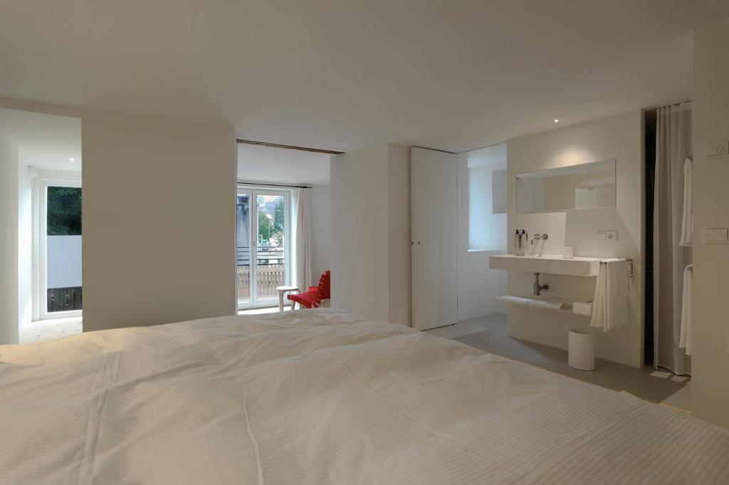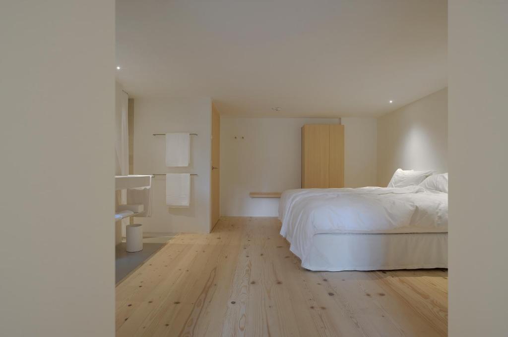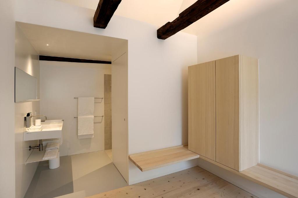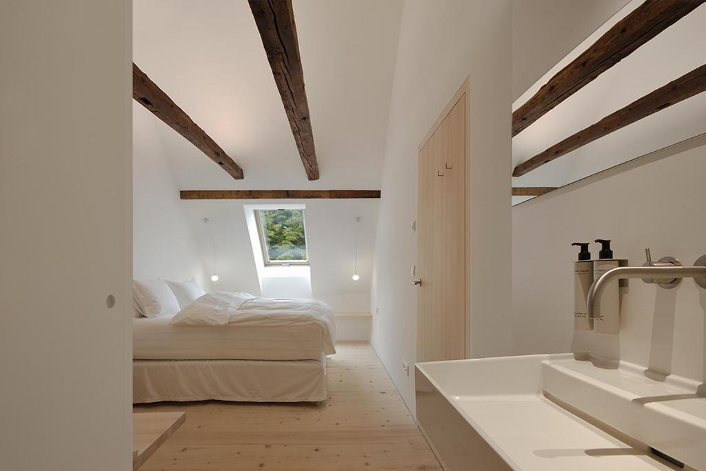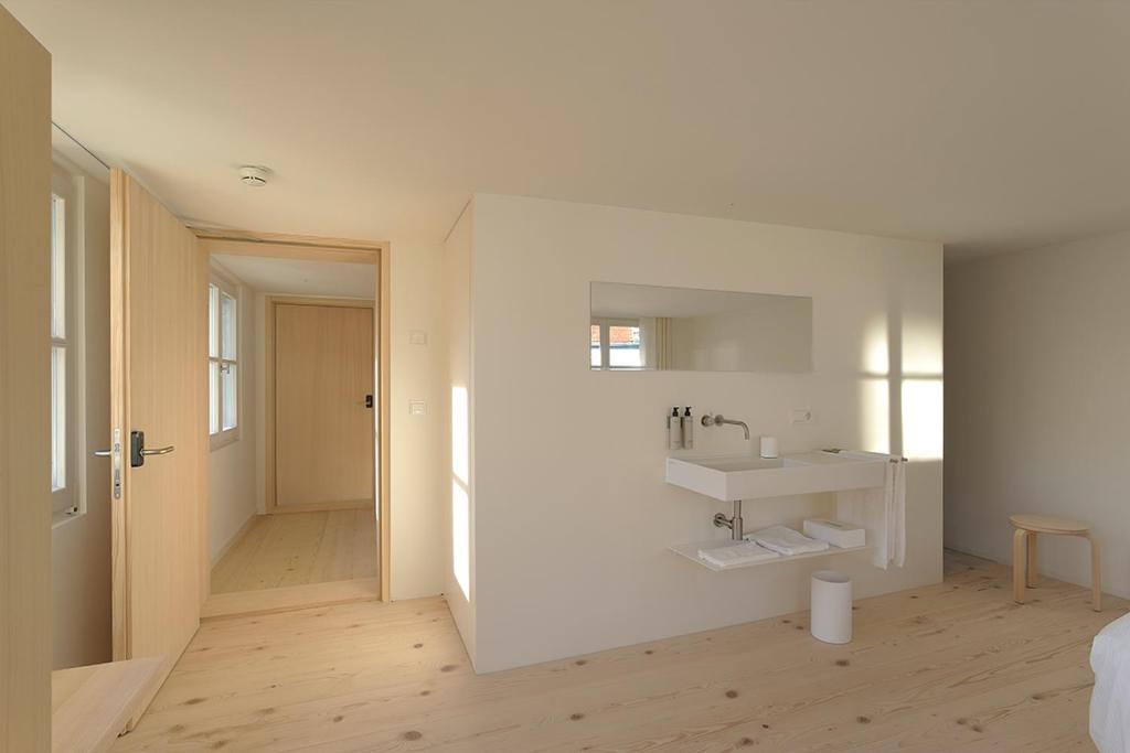 Ten rooms are distributed almost intuitively across the upper floors, each shaped by the irregularities of the historic structure. Rather than forcing uniformity, the design embraces variation—low ceilings in some rooms, soaring gabled heights in others. The attic suite, with its generous volume, offers a contrasting spatial experience, but the essence remains consistent throughout: simplicity, comfort, and clarity. Artworks rotate across the rooms, ensuring the hotel is never entirely static—always subtly evolving.