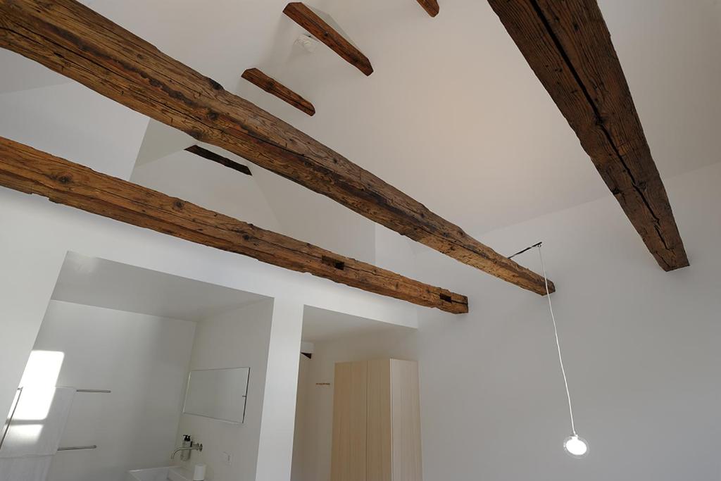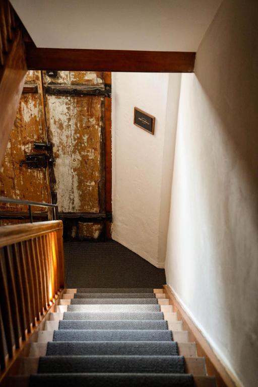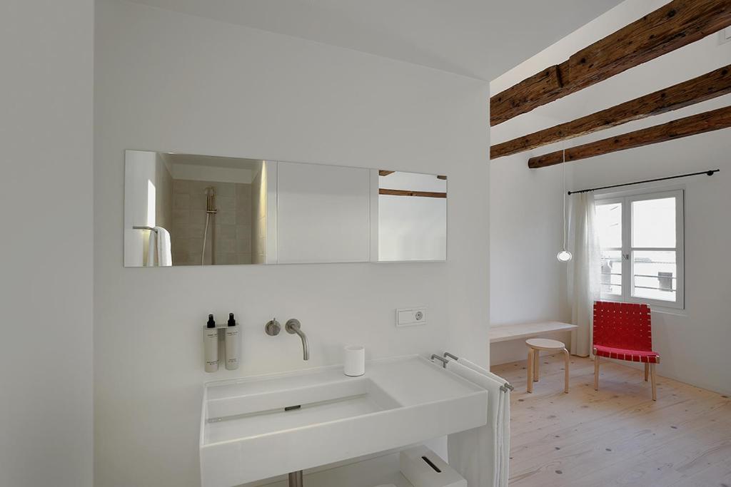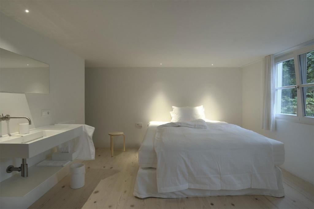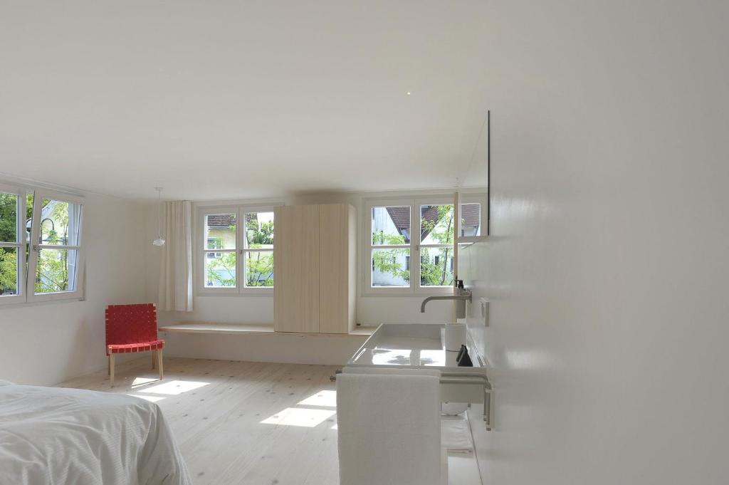 Ten rooms are distributed almost intuitively across the upper floors, each shaped by the irregularities of the historic structure. Rather than forcing uniformity, the design embraces variation—low ceilings in some rooms, soaring gabled heights in others. The attic suite, with its generous volume, offers a contrasting spatial experience, but the essence remains consistent throughout: simplicity, comfort, and clarity. Artworks rotate across the rooms, ensuring the hotel is never entirely static—always subtly evolving.