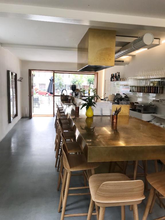The ground floor reclaims its original public function. What was once a bakery is now a modern bar—open, accessible, and integrated into the rhythm of the city. Since 2025, the space has been operated by Copain bakery, bringing coffee, breakfast, and a steady flow of locals into the building. It’s less a hotel facility and more a shared space—blurring the line between guest and passerby. The atmosphere remains daytime-focused: light, casual, and quietly social.
