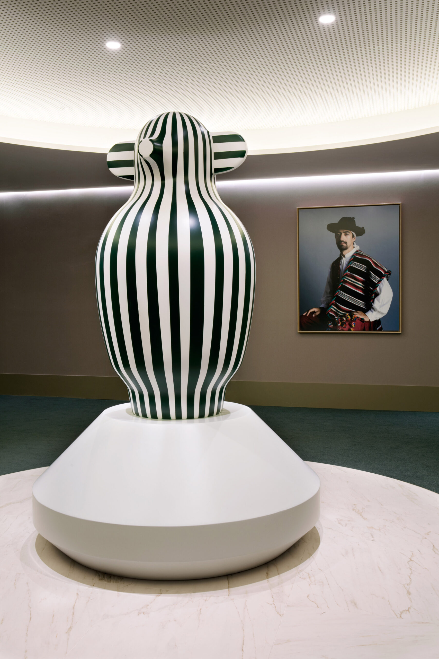 At the core of the hotel’s transformation is celebrated Spanish designer Jaime Hayón, whose signature blend of elegance and surrealism gives the space its singular identity. Expect jewel tones, sweeping curves, gold flourishes, and sculptural forms that walk the line between sophisticated and theatrical. The lobby alone sets the stage—a giant zebra-striped bear in a top hat greets guests with tongue-in-cheek grandeur.