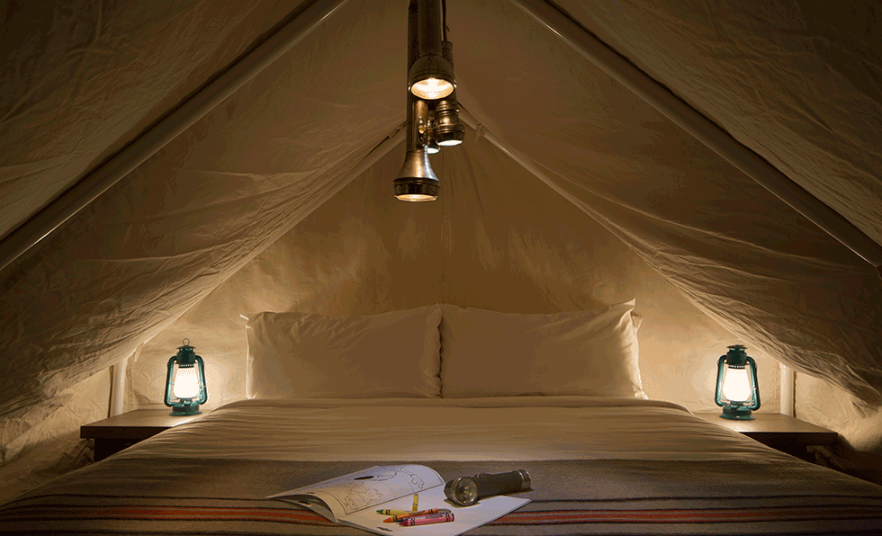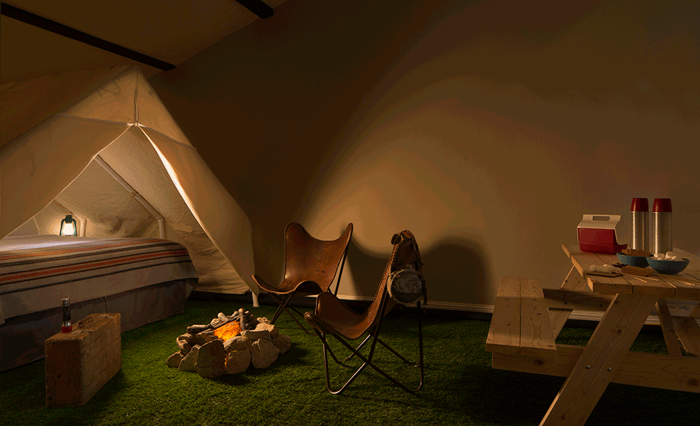 For groups, larger rooms with dual bunk beds keep the design consistent while adding function. Room 105, however, is the star: a whimsical indoor “campsite” where a queen bed rests beneath a white canvas tent on faux grass. A flashlight-inspired light hangs from the peak, while a picnic table and electric campfire complete the scene—perfect for storytelling and nostalgic fun.