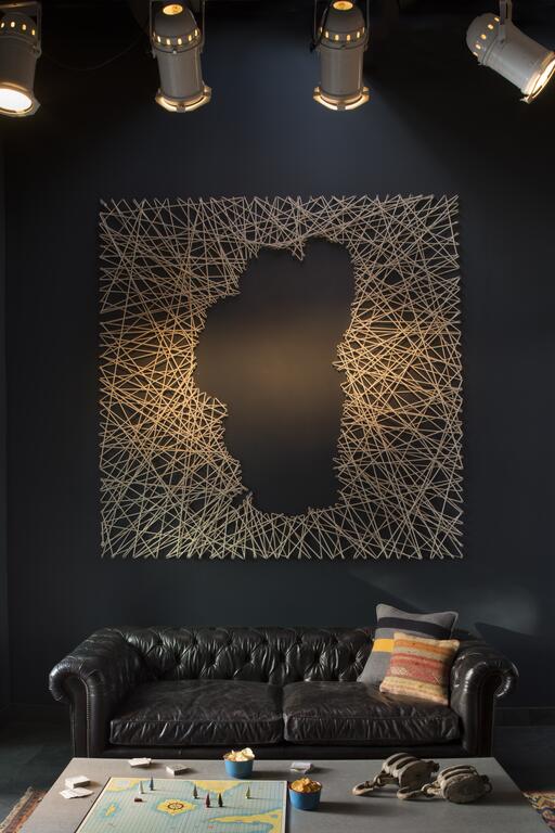 Each room pairs a cool gray palette with industrial details, softened by playful bursts of turquoise in lamps and chairs. Oak nightstands mimic stacked firewood, while headboards stitched from dark canvas display map graphics of Lake Tahoe—subtle nods to the spirit of exploration. Beds are dressed in sturdy military-style textiles, grounding the interiors in a rustic-chic aesthetic that’s equal parts comfort and character.