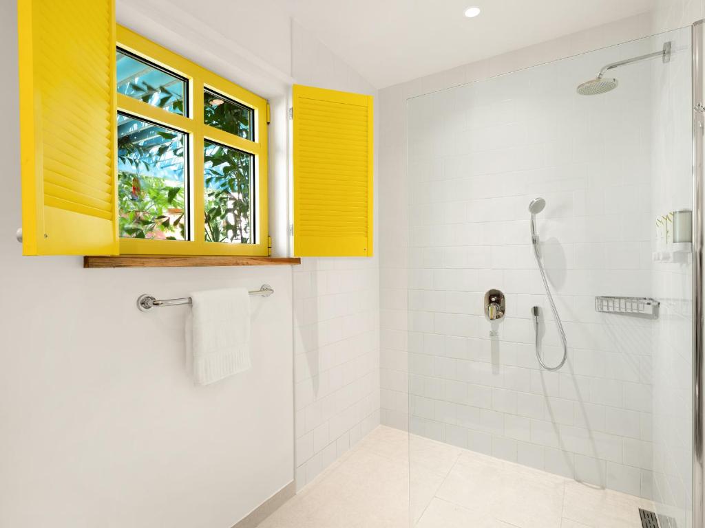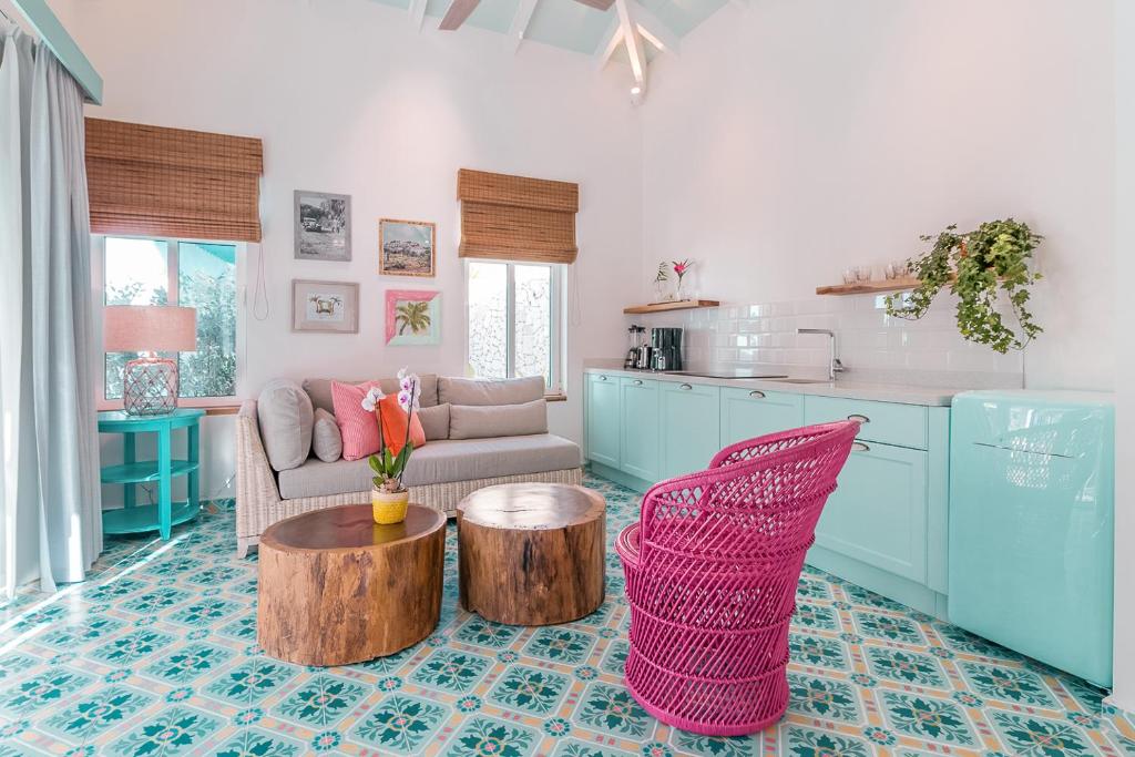 The hotel’s 49 casitas—each one unique—feel like private sanctuaries wrapped in sunshine. Think: crisp white walls accented with splashes of coral, turquoise, and seafoam; handwoven hammocks swaying on shaded patios; and outdoor showers fringed with palms. Inside, the vibe is tropical modern—bright, breezy, and filled with local touches. Artisan tiles, rattan textures, and bespoke Aruban artwork come together to tell a story of place, pride, and playfulness. No two casitas are quite alike, but all share a common thread: comfort that feels effortless, never overdone. Full kitchens, plush king beds, and smart design details make it as easy to stay for a week as for a night.