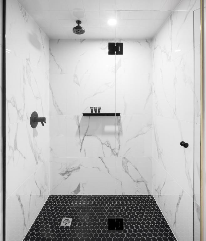 Bathrooms are slick and functional with rainfall showers, custom bath amenities by local makers, and vintage-style tiles that nod to the building’s bones. For extra room to sprawl, the Dominion Suite delivers wraparound windows, a freestanding soaker tub, and just enough glamour for a celebratory weekend—or a staycation upgrade.