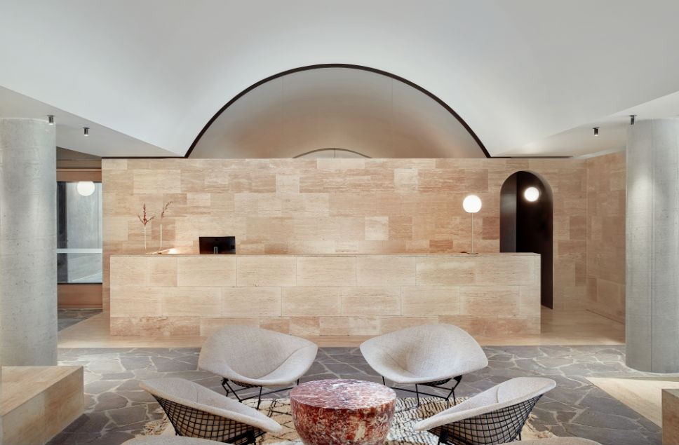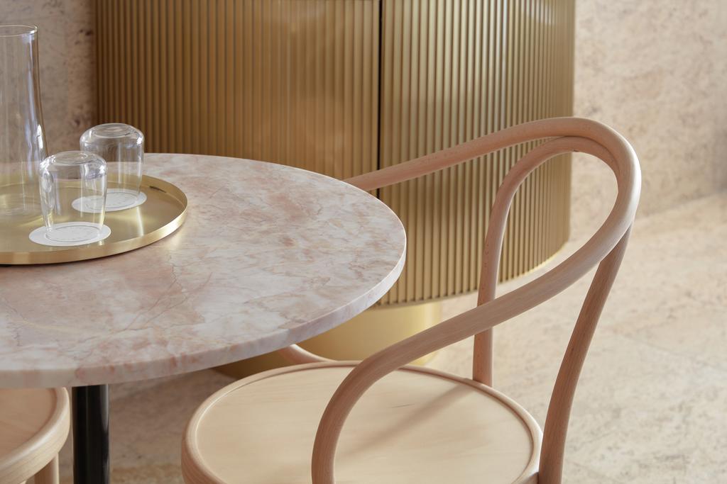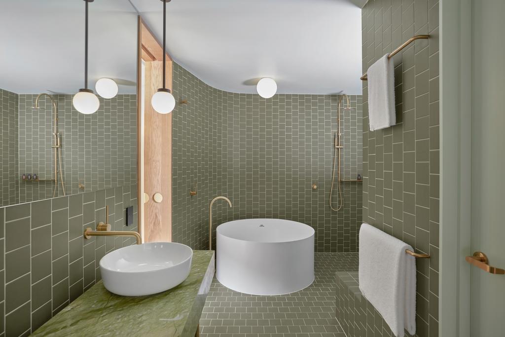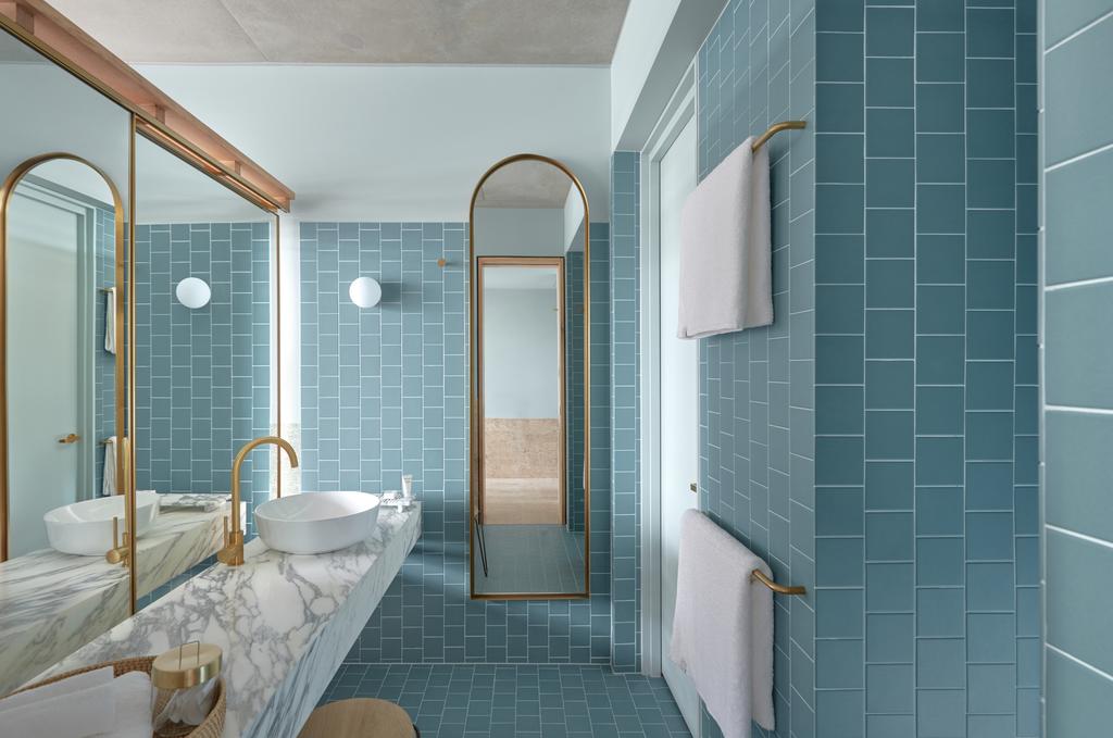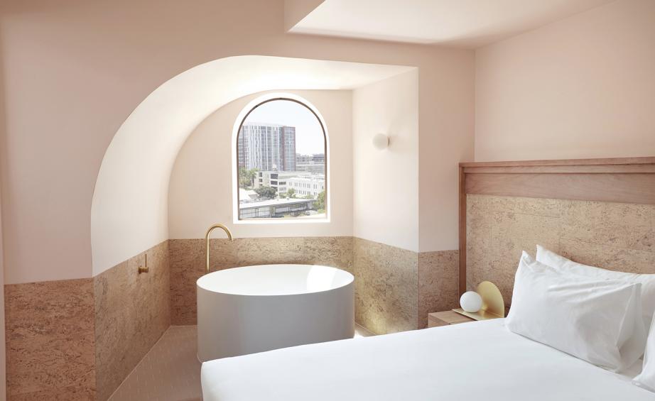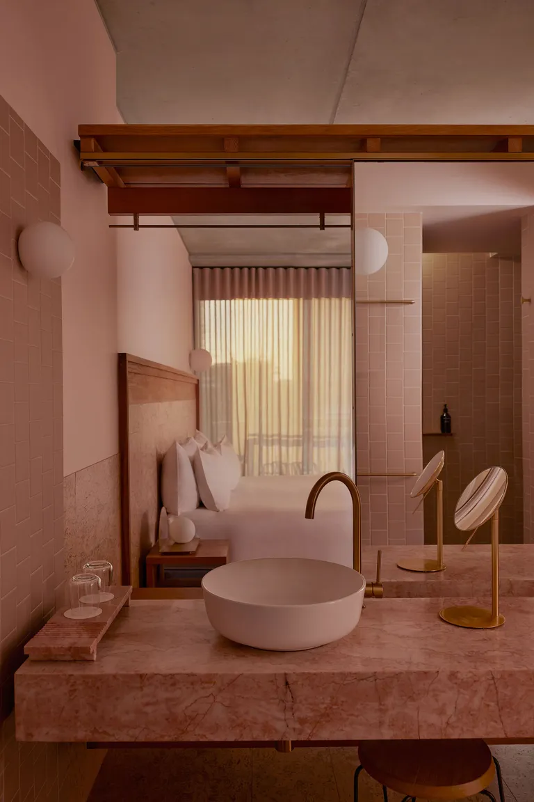 Guest rooms are pure tactile bliss. Cork floors, sisal rugs, curved walls, and marble bathrooms come together in a palette of pastels and soft neutrals that feel both modern and soothing. Every room includes a balcony and operable windows—a rare city-hotel luxury that brings breezes, natural light, and neighborhood views into the experience. The result? Less five-star formality, more sun-kissed urban sanctuary.