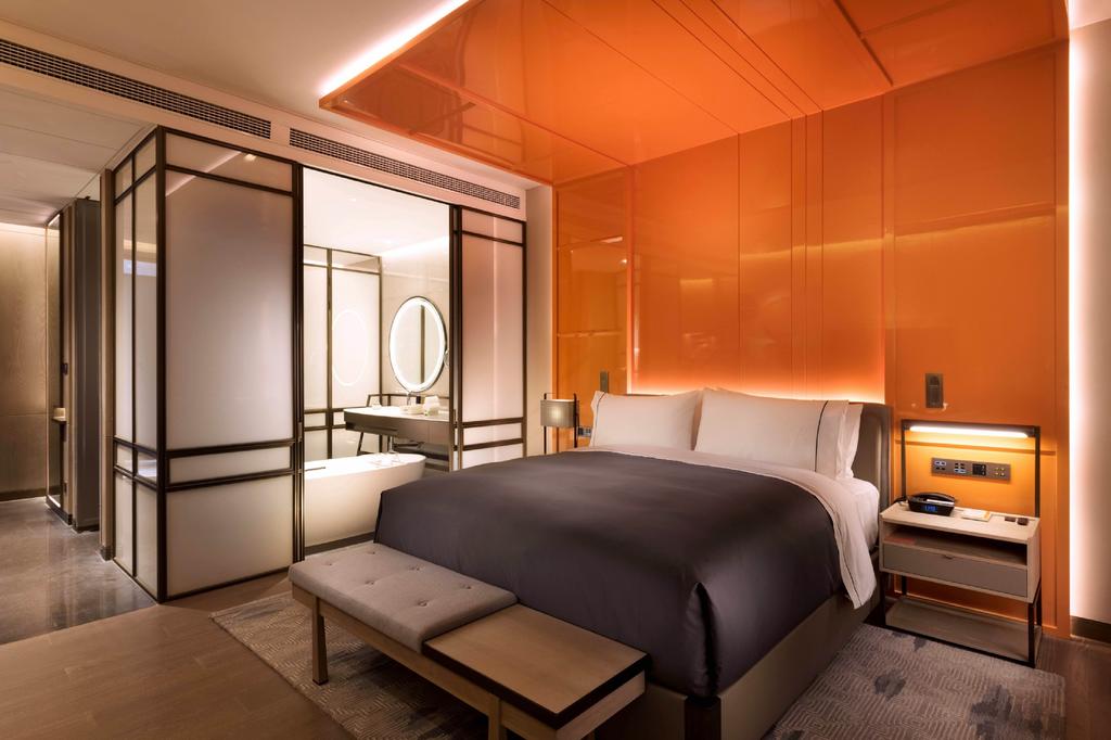 Canopy’s design philosophy is rooted in local context, and in Chengdu, that means celebrating the city’s textures, rituals, and sensory richness. Interiors are anchored in soft, grounding greys, punctuated by bursts of fiery orange—an unmistakable nod to Sichuan’s iconic hot pots, opera rouge, and lantern-lit nights. Subtle references to winding alleyways, teahouse culture, and traditional crafts are woven into the materials and forms, giving the space a layered, narrative-driven feel. The result is an atmosphere that’s sleek but never sterile, contemporary yet deeply connected to place. Guest rooms follow suit: minimalist and calming, with warm wood floors, tactile textiles, and locally inspired artwork. Each detail—from the curve of a ceramic lamp to the weave of a throw—feels considered, contextual, and quietly luxurious.