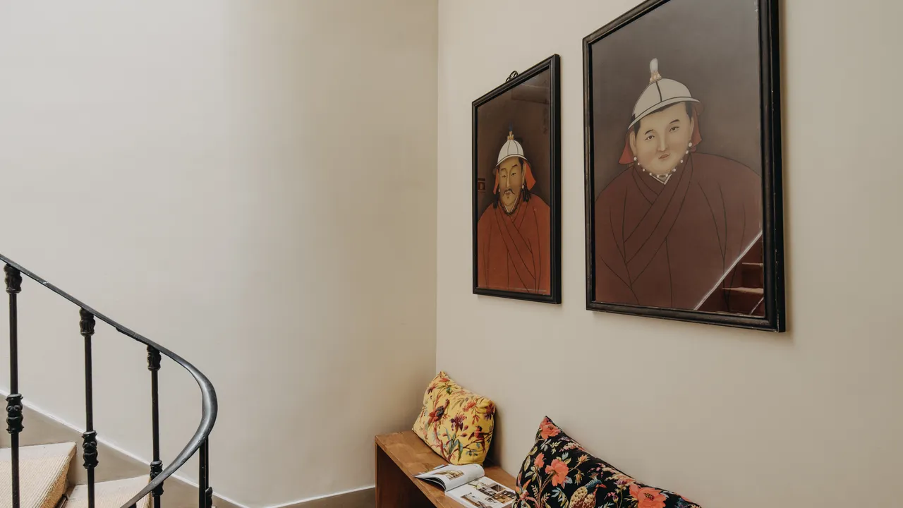 At the core of Casa das Janelas com Vista is its living room, which also serves as reception and breakfast area—a convivial space where guests gather, talk, and unwind. Eclectic décor mixes molded rocking chairs with antique silver candlesticks, leather ottomans, and modern light installations made from postcards of Chinese paintings. By day, the room is bathed in sunlight, perfect for reading, journaling, or simply watching Lisbon unfold through the windows. By evening, it transforms into a cozy refuge, ideal for savoring Portuguese cheeses and local wines. It’s the kind of space that feels effortlessly personal, encouraging guests to slow down and savor the small luxuries of stillness and connection.