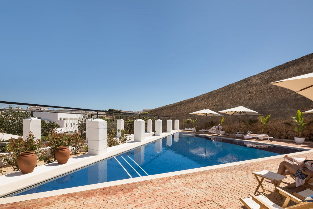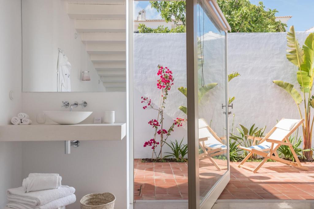 The heart of Casa Mãe is its courtyard restaurant, which opens onto a sunlit terrace framed by olive trees and climbing vines. The menu follows a farm-to-table philosophy, with ingredients sourced from the hotel’s own vegetable garden just steps away. Beyond the courtyard, a swimming pool glimmers under the Algarve sky, while a verdant orchard invites slow morning walks. The scent of citrus and the sound of church bells mingle in the air—a sensory reminder that you’re in the heart of Lagos, surrounded by its everyday beauty. Despite being tucked into the city’s narrow streets, the Atlantic glints in the distance, its salt air drifting through the property and linking the experience to the sea. From here, several of the Algarve’s most stunning beaches are only minutes away, completing the circle of Casa Mãe’s coastal charm.