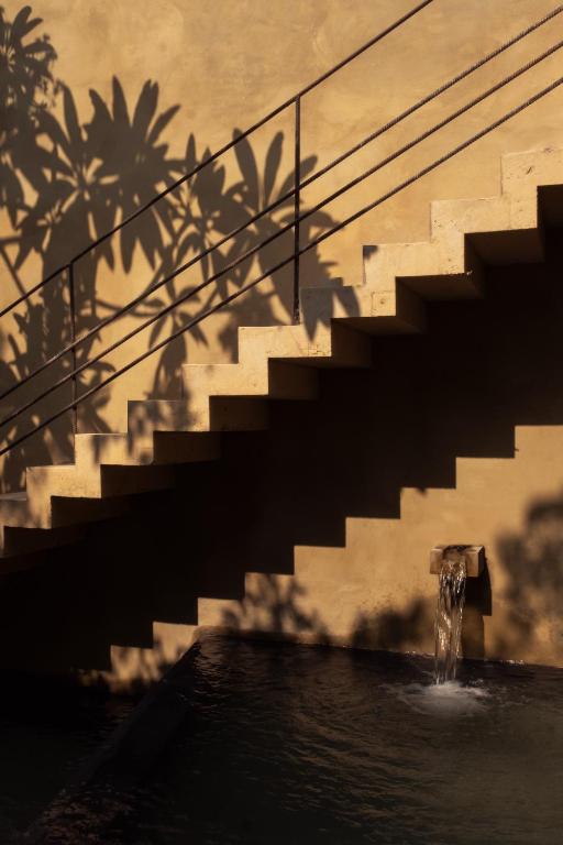 At the center, reclaimed stone paving and soothing water features anchor the courtyard in serenity. The sound of running water softens the air, while sunlight dances across surfaces in constant dialogue with the environment. A shimmering mosaic-tiled pool reflects the sky and foliage, creating patterns that shift and evolve throughout the day—an ever-changing canvas of light and water.