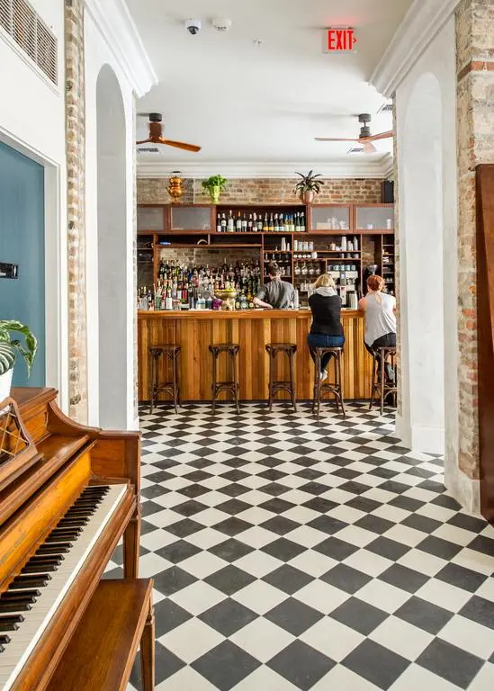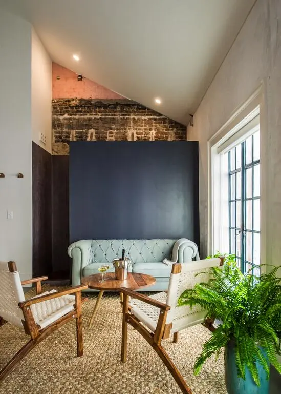 Behind its historic façade, the interior aesthetic shifts into something fresh and intentional — exposed brick walls, industrial light fixtures, tropical-green jolts of color. Guestrooms are minimalist, but never cold. Sunlight, patina, a hint of the Caribbean breeze, a wink to Southern hospitality — the design is unfussy and honest, with just the right amount of polish. It’s not show-off luxury. It’s intimacy. It’s soul.