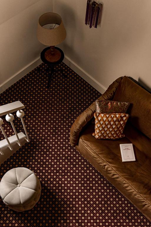From the moment you step into the lobby, sunlight floods through generous windows onto textured wood walls, creating an uplifting and warm welcome. The centerpiece is a striking marble and dark wood bar flanked by velvet benches, red floor tiles, and bespoke Murano glass chandeliers. The lounge continues the theme with fringed armchairs, Persian rugs, and a brass‑adorned fireplace—a nod to the legendary Belgian designer Victor Horta.