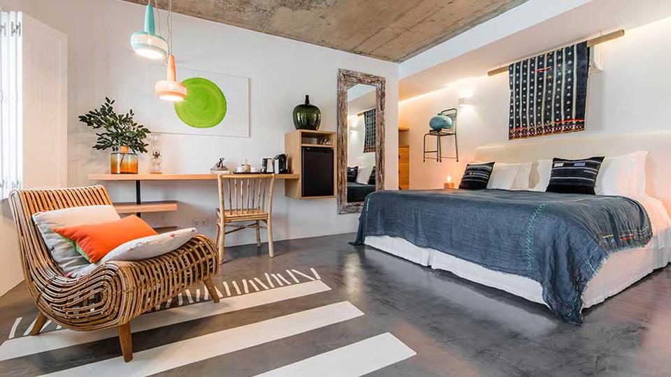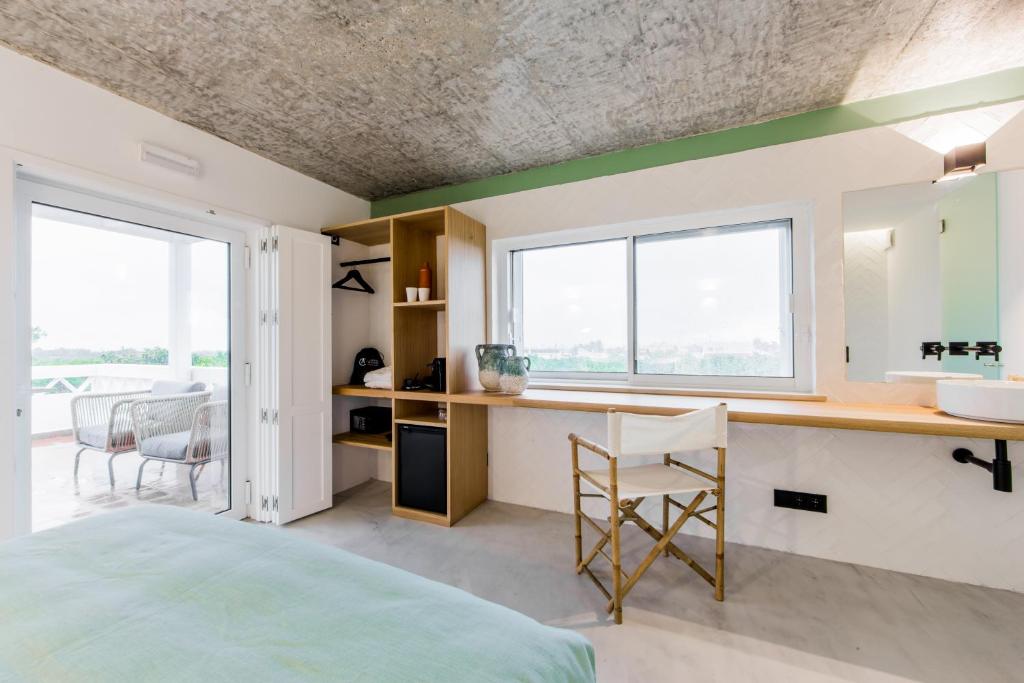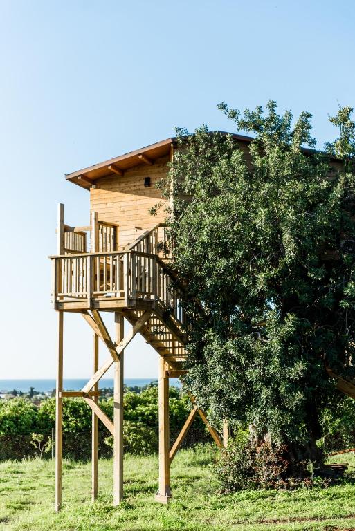 Each of the twelve rooms, suites, and apartments embodies a unique narrative. Couples gravitate toward the romantic suites with outdoor jacuzzis or private terraces overlooking the orchards. Families find comfort in the spacious apartments, complete with kitchenettes and shaded dining patios. For dreamers and design-lovers, there’s the Treehouse, a whimsical refuge perched 6.5 meters high in a carob tree, where sunrise feels like it’s yours alone. Even more striking is the converted warehouse loft, its high ceilings, concrete floors, and sleek lines softened by woven rugs and natural light. Whether rustic or refined, every space whispers the same promise: quiet, comfort, and connection.