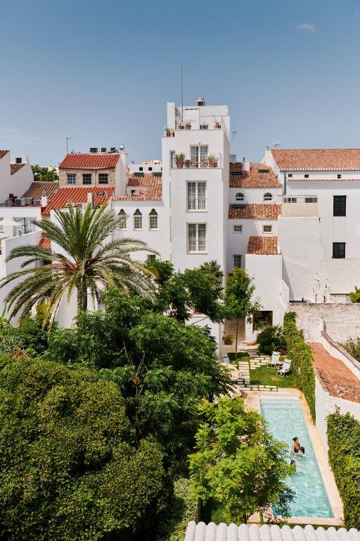 Step outside and the energy shifts. At the heart of the property lies a shaded courtyard where a serene pool waits quietly. It doesn’t attempt to compete with the nearby Menorcan sea—because it knows it can’t. Instead, it offers a gentle interlude: a place to cool off after wandering Mahón’s streets, or to recline with a book before setting out for a saltwater swim.