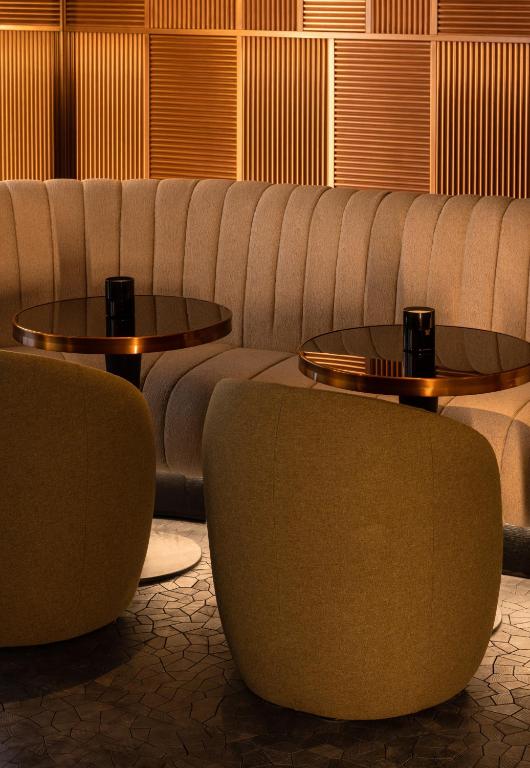The interiors, designed by Raphael Navot, highlight craftsmanship and materiality at every turn. A palette of smoked oak, fluted glass, textured stone, and striking Zimbabwean granite forms the hotel’s tactile language. Furniture and fixtures are custom‑designed, emphasizing curved profiles and seamless finishes that evoke the fluidity of 1950s design while avoiding pastiche.