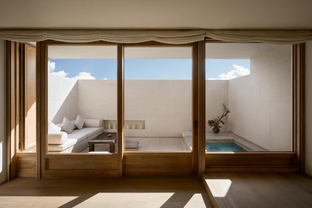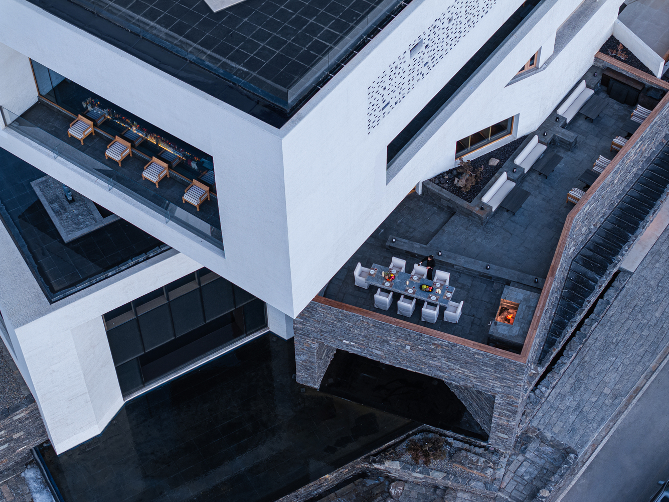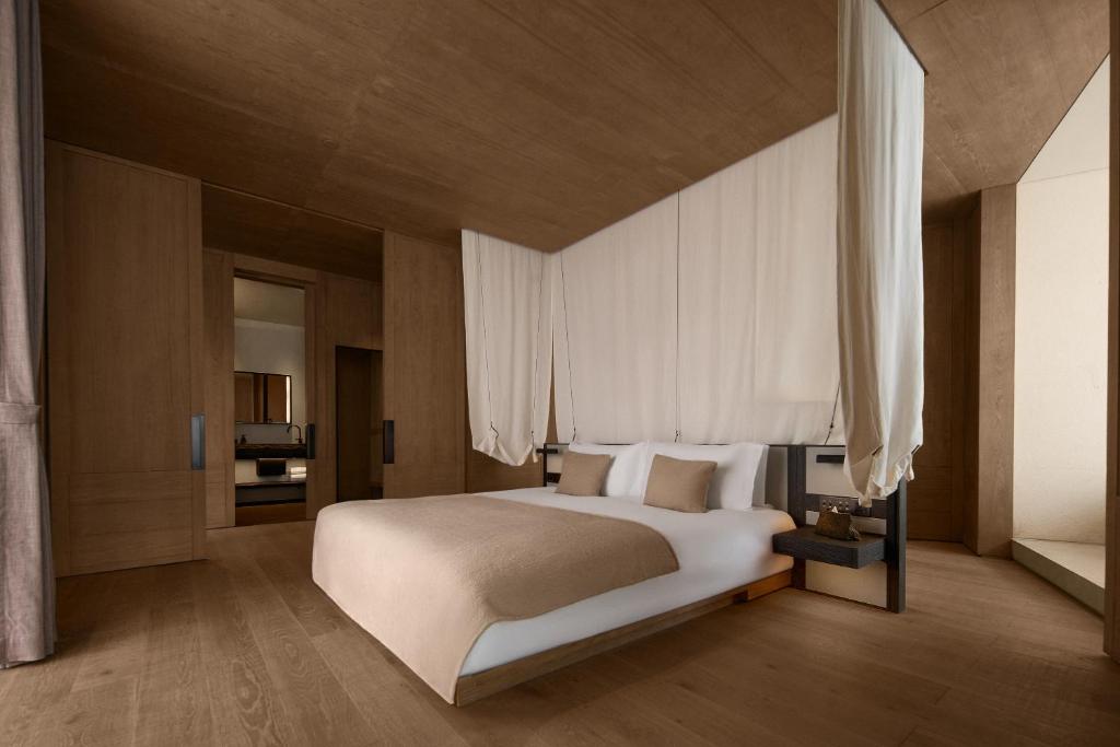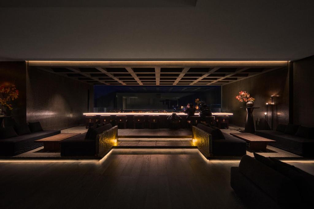 Public areas showcase the hotel’s architectural drama at its boldest. Vast lounges hover between earth and sky, with sculptural staircases and walls of glass dissolving the boundary between inside and out. Thoughtful lighting transforms the atmosphere from day to night, casting dramatic shadows on stone walls and creating spaces that feel as cinematic as they are comforting. Restaurants celebrate the region’s flavors beneath soaring ceilings, while terraces invite guests to linger at the edge of infinity.