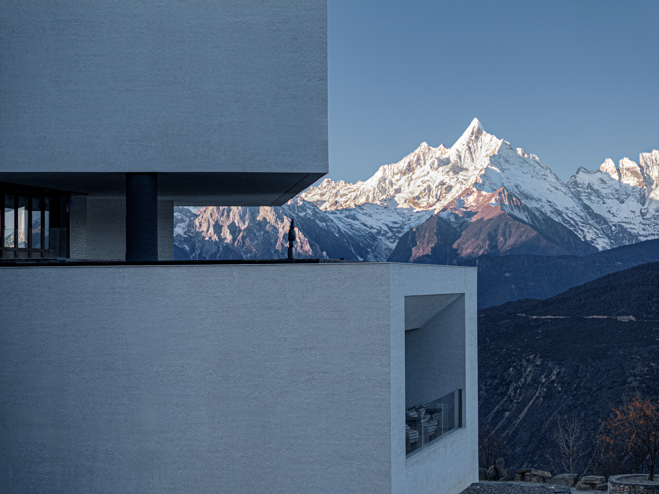 Set high in the mountains of Deqin, on the edge of Yunnan’s sacred Meili Snow Range, Deqin Meri Poodom is not just a hotel—it’s a landmark in design. Its striking architecture rises like a sculptural mirage against the jagged Himalayan peaks, blending local Tibetan inspiration with futuristic forms. Built into the contours of the land, the hotel’s dramatic silhouette is defined by sweeping curves, sharp angles, and expansive glass facades that frame the surrounding sky, summits, and valleys like living works of art.