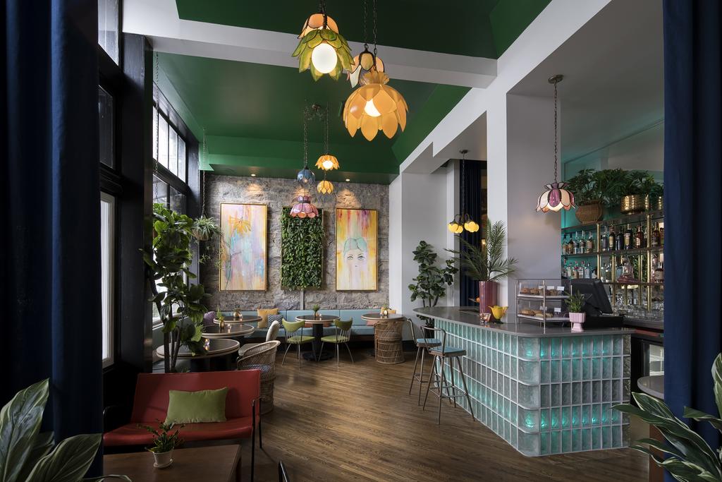 The lobby lounge sets the mood with bold colors and eclectic décor—part living room, part retro set piece. Guests gather in the playful bar, where jewel tones and brass glint against moody lighting, creating a scene as cinematic as it is convivial. This is not a buttoned-up hotel—it’s social, spirited, and designed for conversation as much as repose.