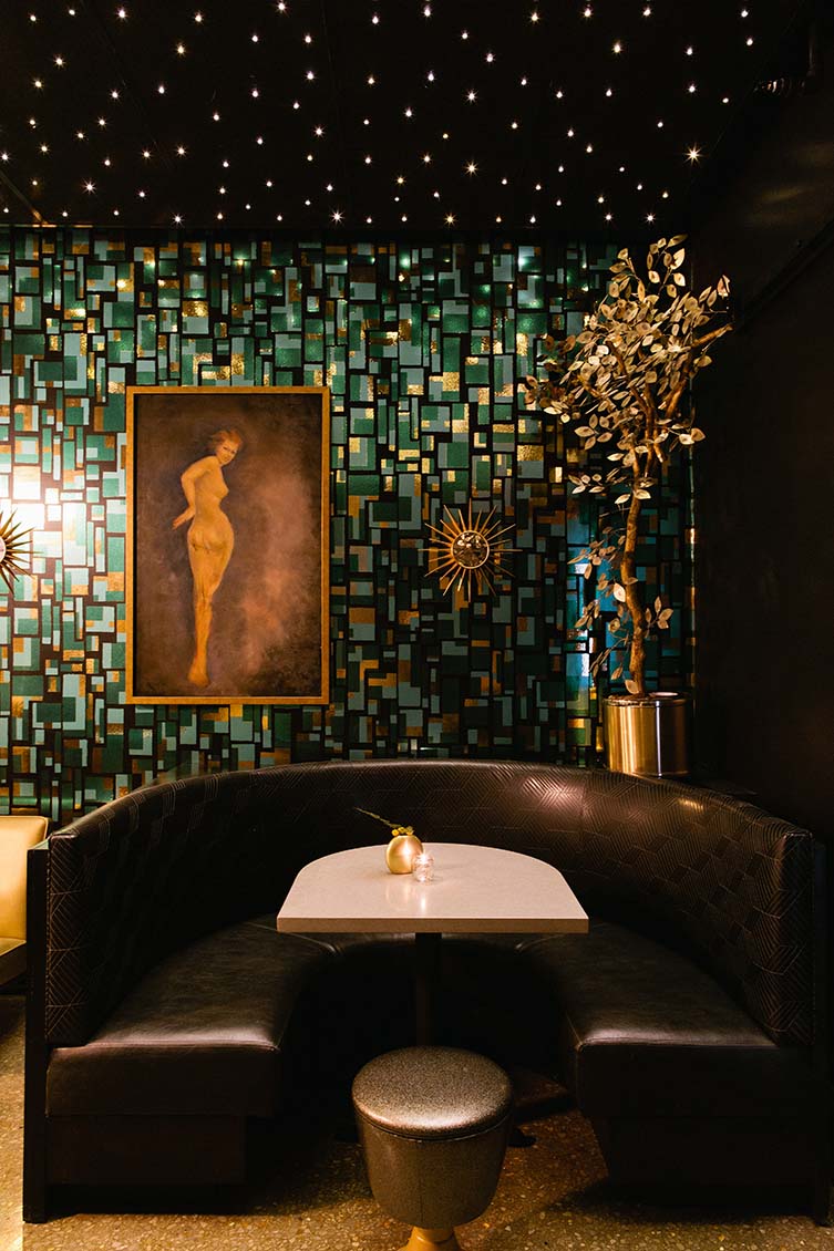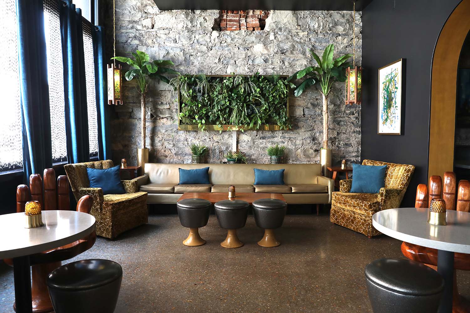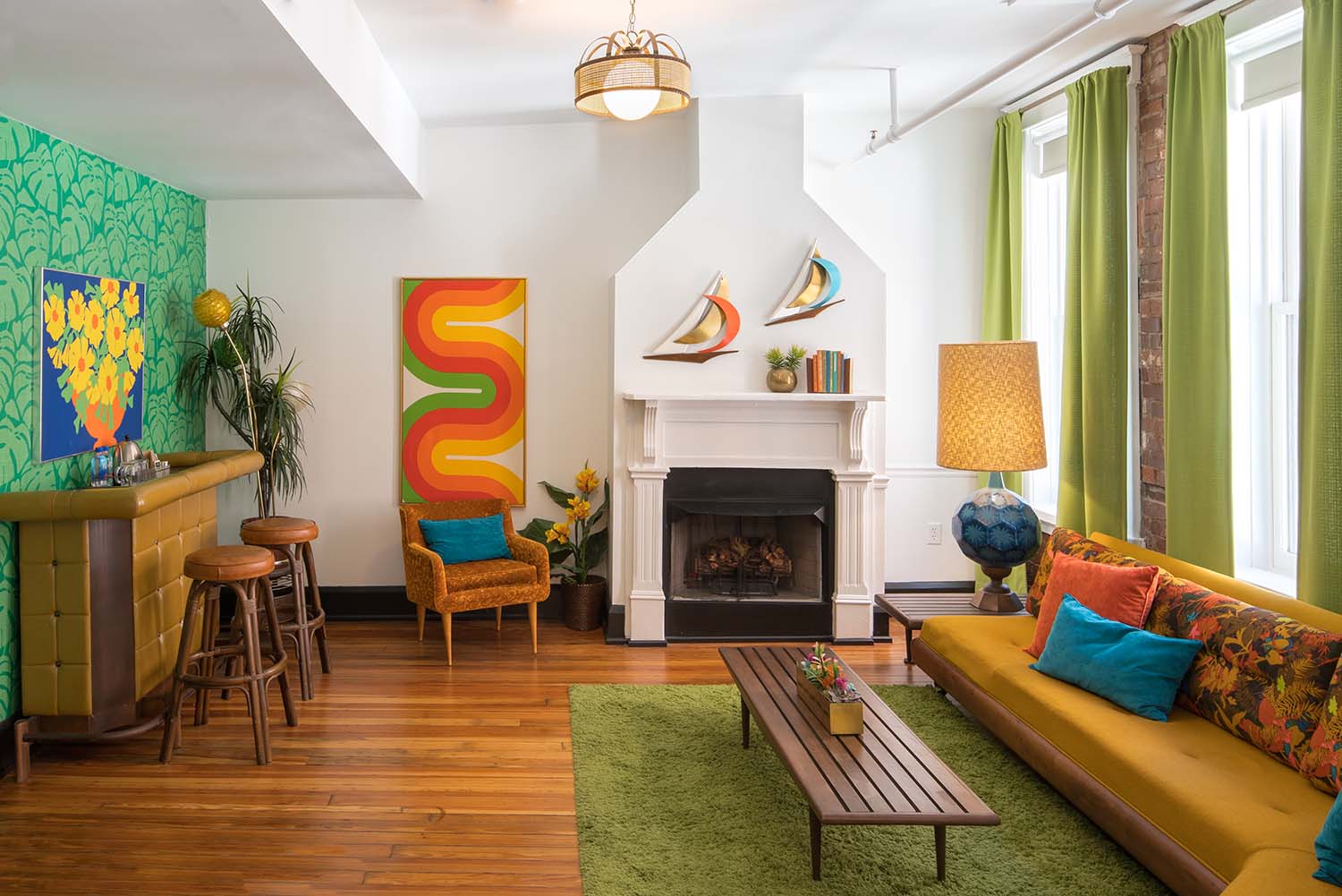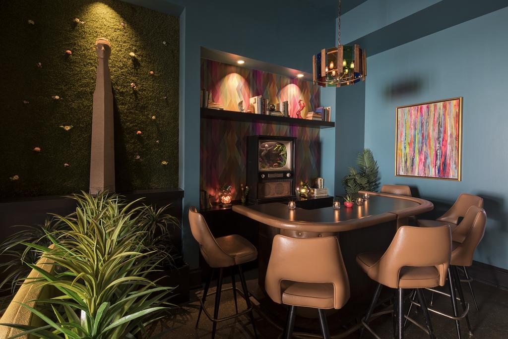 Every corner of The Dwell feels like a love letter to mid-century modern design, filtered through a whimsical, slightly irreverent lens. Interiors splash bold patterns across walls and floors—think geometric wallpapers, jewel-toned velvets, brass accents, and terrazzo-style tiling. Guestrooms each boast a distinct personality, with retro furnishings, Sputnik chandeliers, and vintage artwork that nods to the 50s and 60s without lapsing into kitsch. It’s immersive, theatrical design—playful yet stylish, retro yet modern.