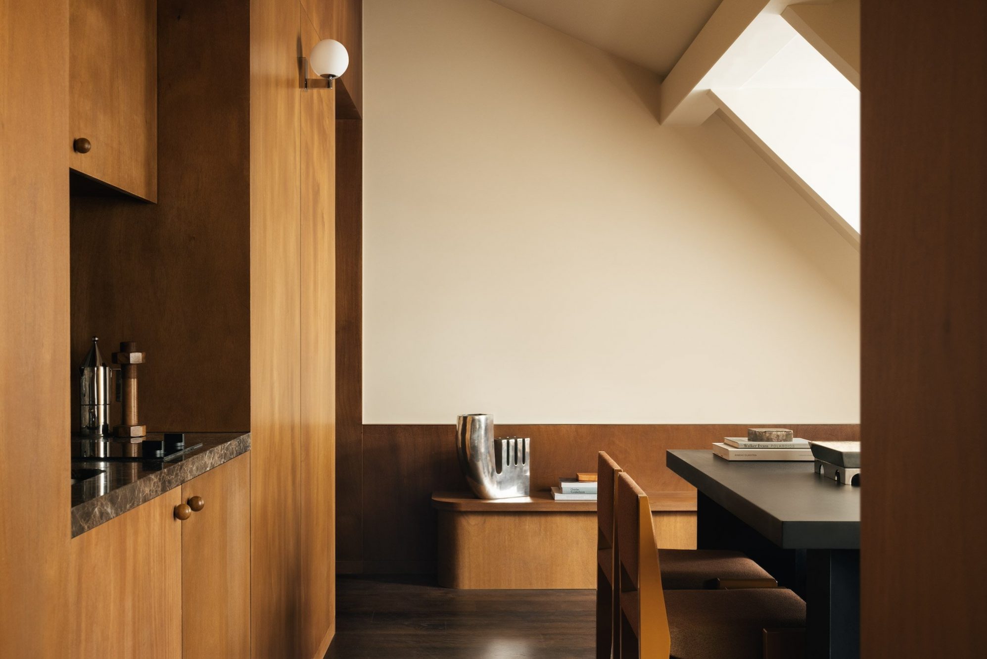 The interiors embrace warm‑toned, floor‑to‑ceiling wood paneling, creating an enveloping sense of comfort and intimacy. Blocky, geometric furniture inspired by 70s modernism adds a playful rhythm to the spaces, while Bauhaus‑influenced principles of form and function ensure every detail has purpose and balance.