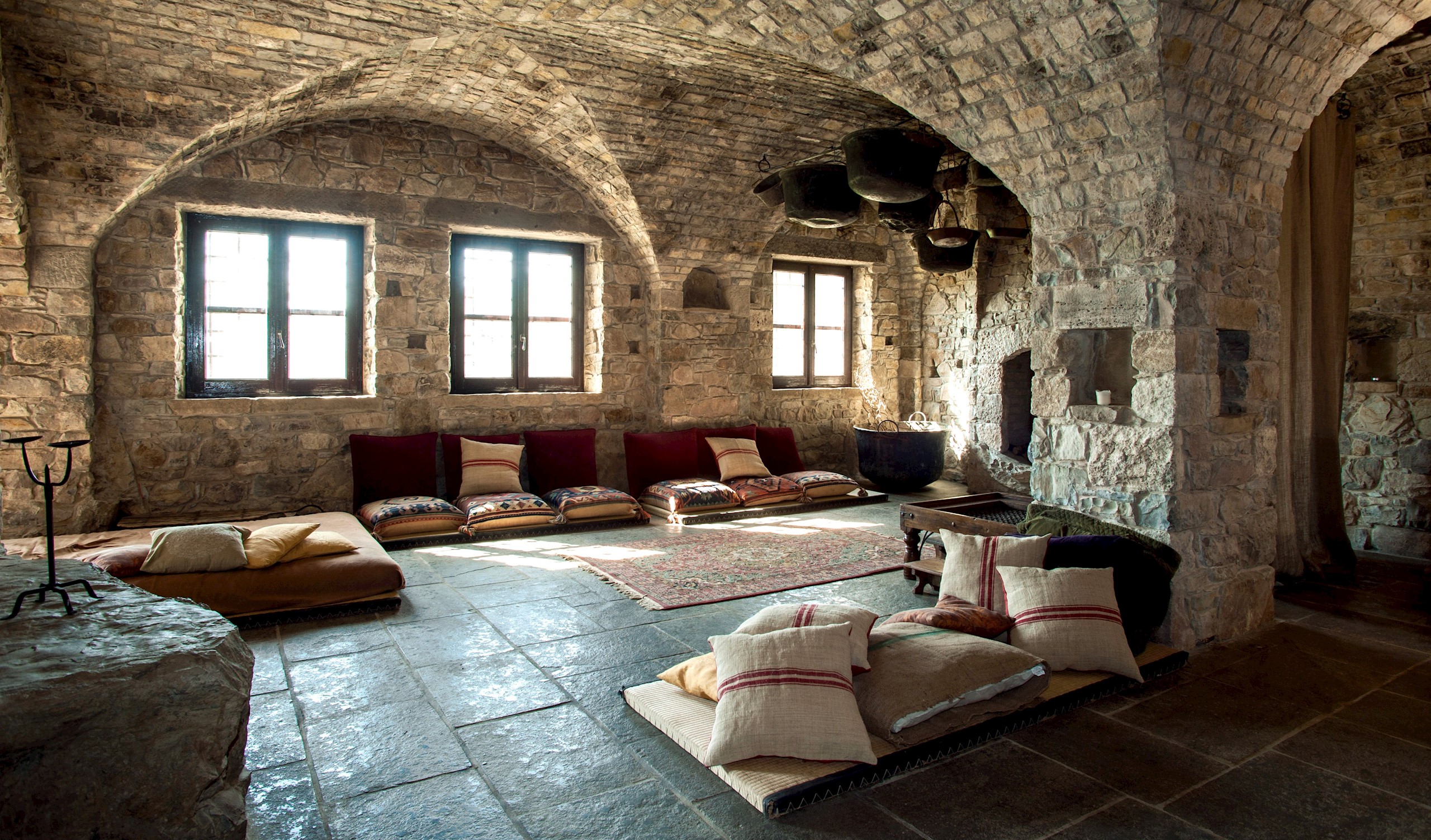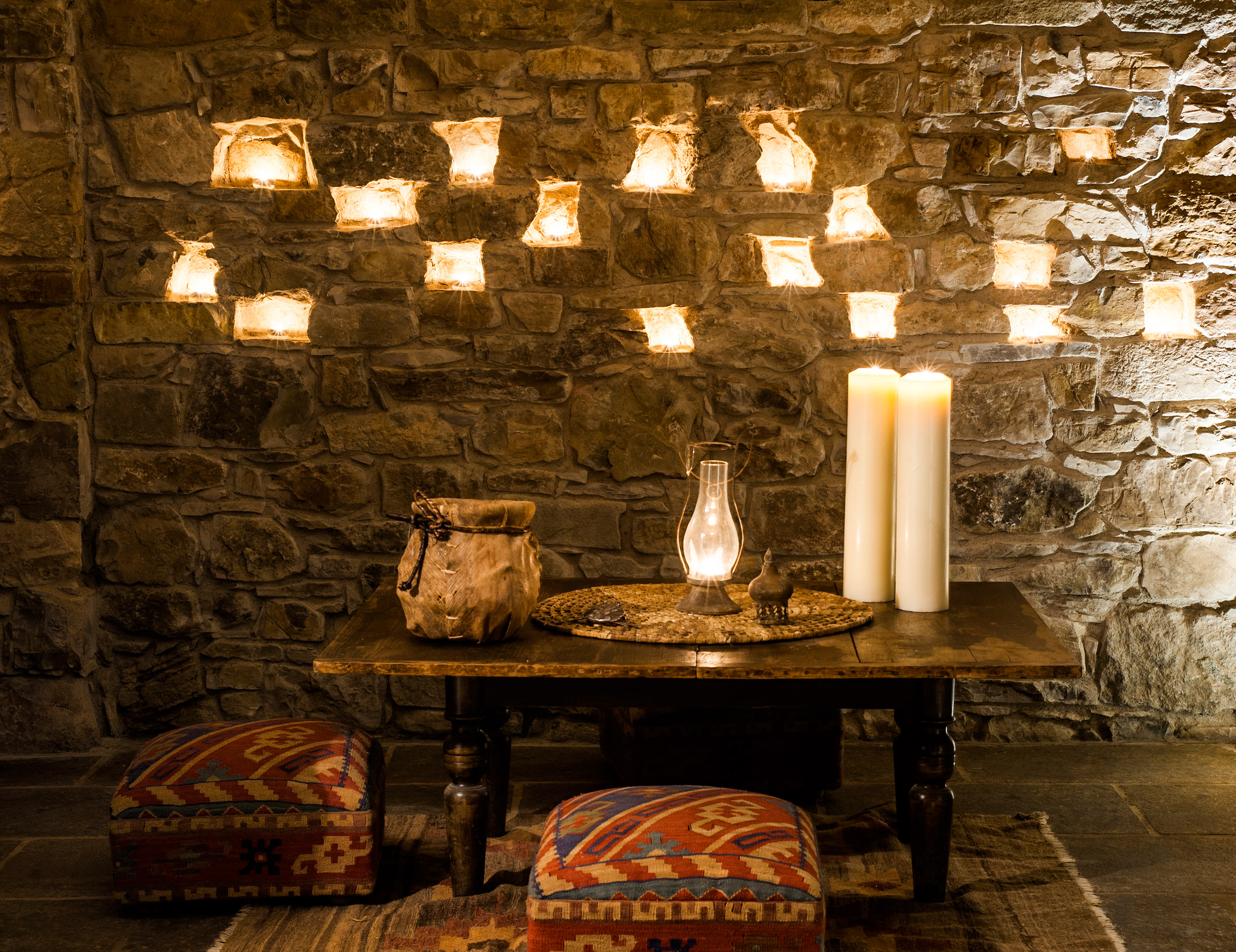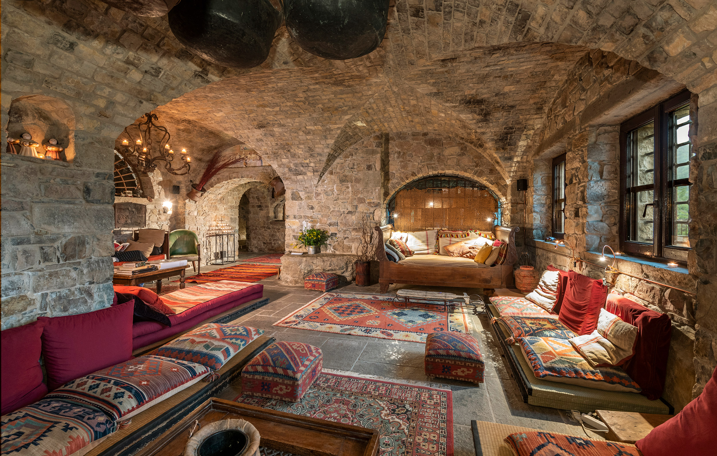 On the site of a crumbling rural house, Eremito rose stone by stone—130,000 of them—over four years, following the craft of 13th-century Italian masonry. The result is a retreat that feels as though it has stood for centuries, seamlessly blending into the rolling Umbrian hills. Behind its timeworn façade, however, lies a quietly radical approach to sustainability: the entire property is powered by solar energy, while much of its gentle light comes from candles, deepening the meditative atmosphere.