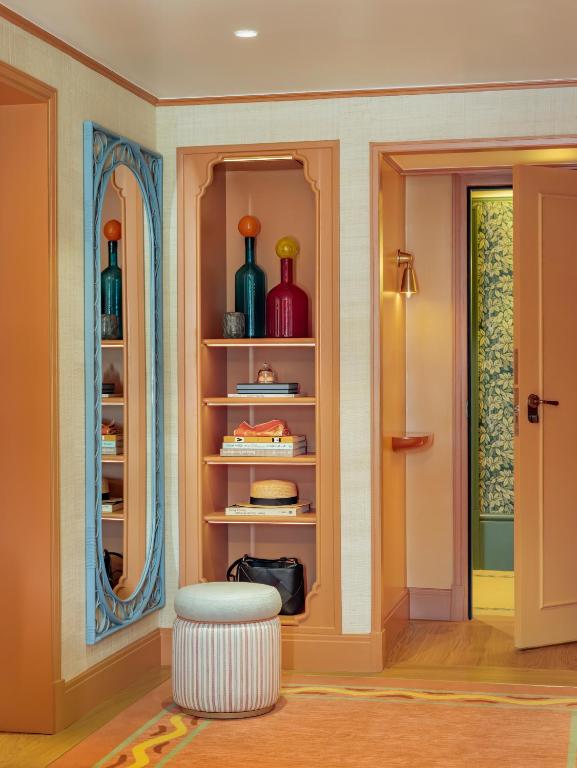 From the moment you step inside, La Fantaisie feels like stepping into a dreamy, nature-swept reverie. Brudnizki’s design language reads like a garden in full bloom—walls in sun-drenched corals, leafy greens, and lemon yellows, ceilings swathed in floral wallpaper, and rooms filled with playful textures that nod to both Parisian elegance and pastoral fantasy.