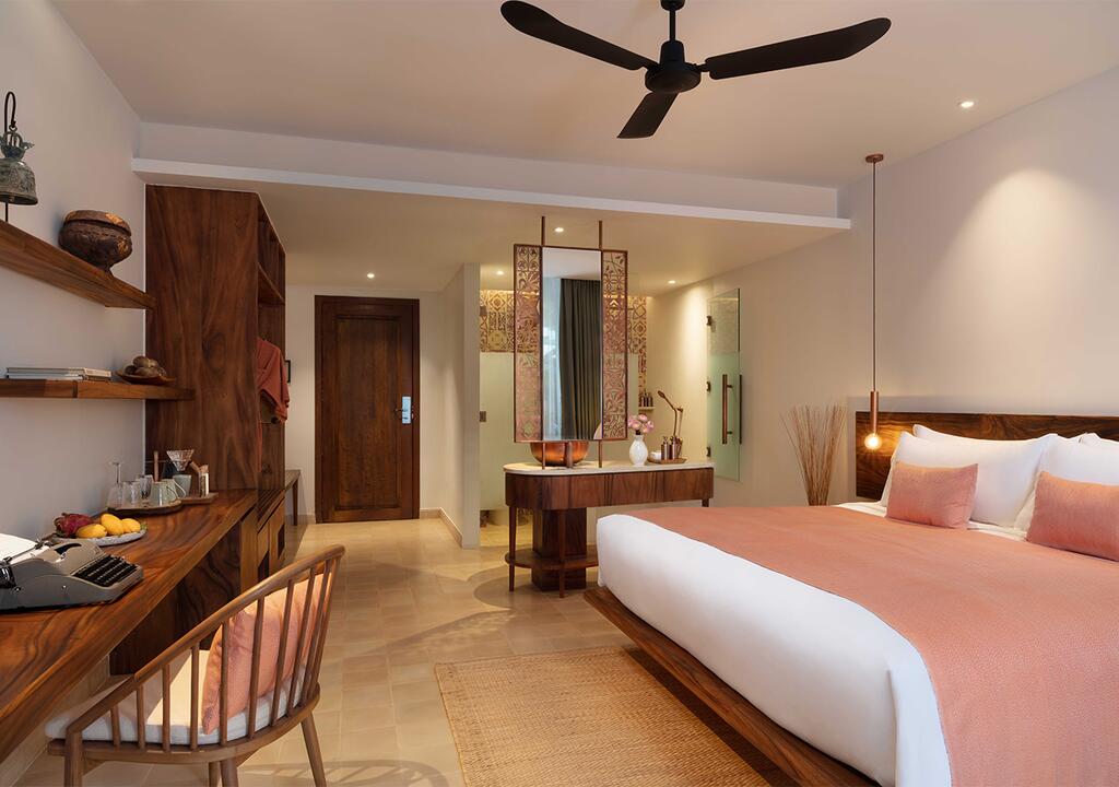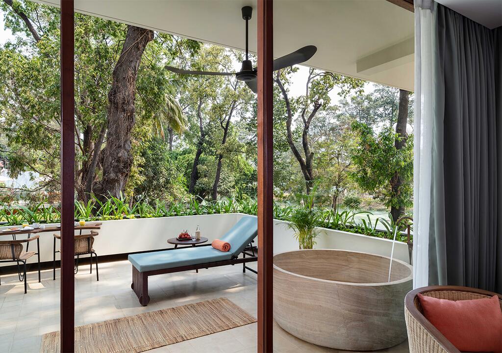 The rooms and suites at FCC Angkor are bright, airy, and deeply comfortable. Large windows frame garden or pool views, while interiors feature a palette of natural materials, local art, and soft, calming tones. Every detail—plush beds, spacious bathrooms, curated accessories—is designed to feel welcoming and personal, more private retreat than standard hotel room.