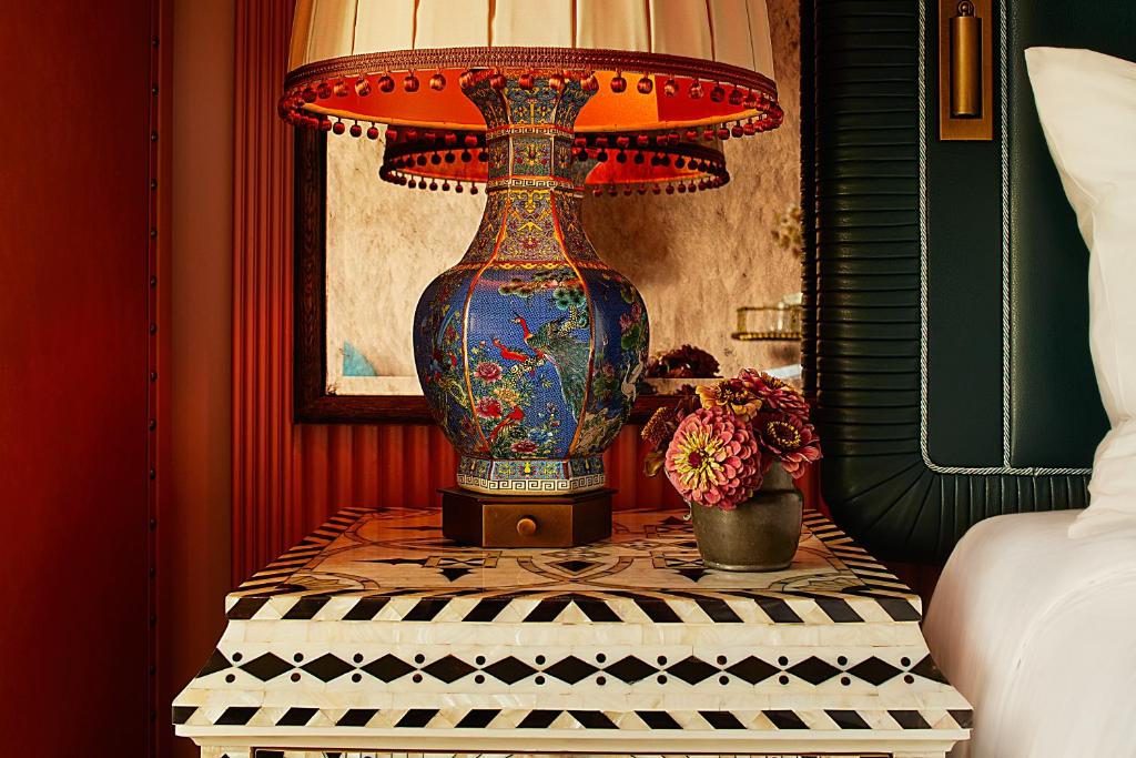 The interiors are the stuff of maximalist fantasies. Expect rainbow-hued crystal chandeliers, tiger-striped rugs, tasselled velvet drapes, and rose-silk-wrapped elevator lobbies. Animal-printed wallpapers meet vintage mirrored walls. Pink corridors meet black-and-white inlay tables. No corner is overlooked. It’s romantic, eccentric, and impossibly chic.