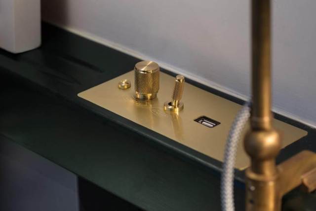 Inside, The Fleming is tonal, tactile, and atmospheric. Woods are warm, not glossy. Brass is brushed, not flashy. Greens, navies, and creamy deckchair tones play against each other like sea and sun and oxidised metal. The lobby and common spaces balance industrial grit with maritime elegance — a Hong Kong that remembers itself. And unlike many of the city’s cookie-cutter business hotels, here the design goes all the way down to the smallest gestures: door signs that resemble ship telegraphs. Vintage-style dials and toggles. A signature scent that blends sandalwood and amber and instantly taps the limbic system.