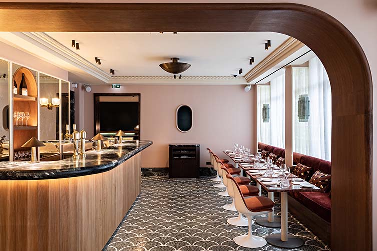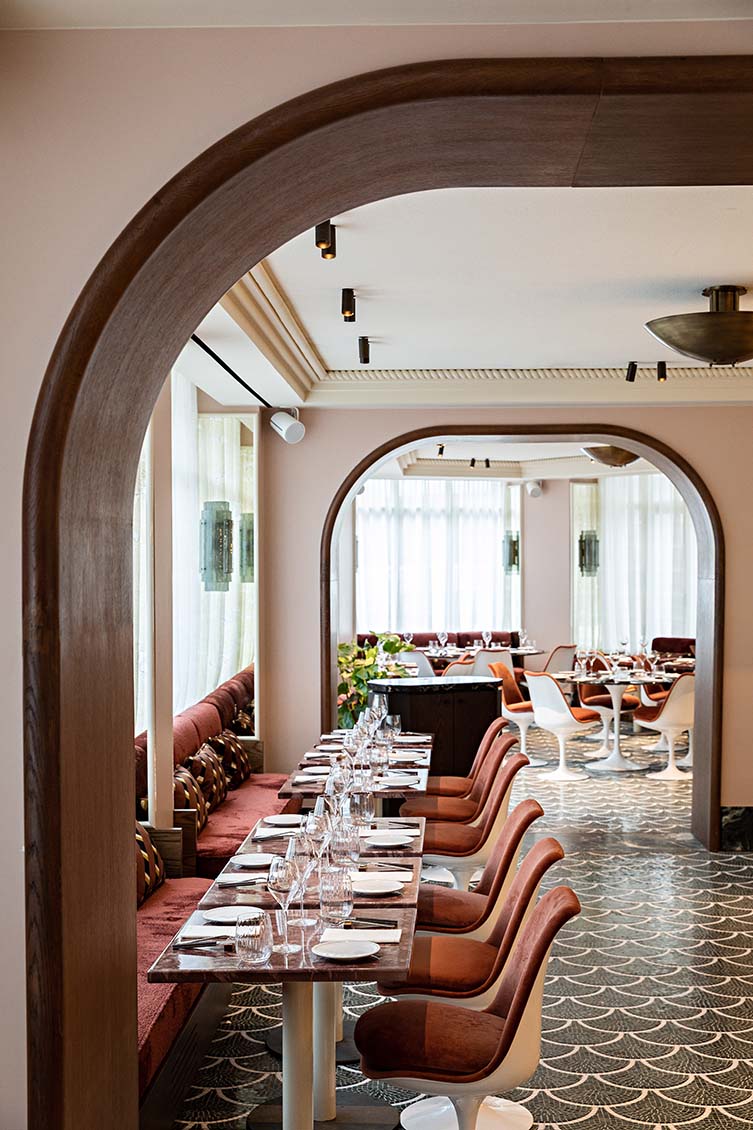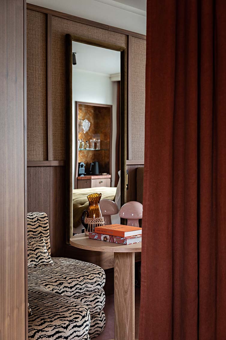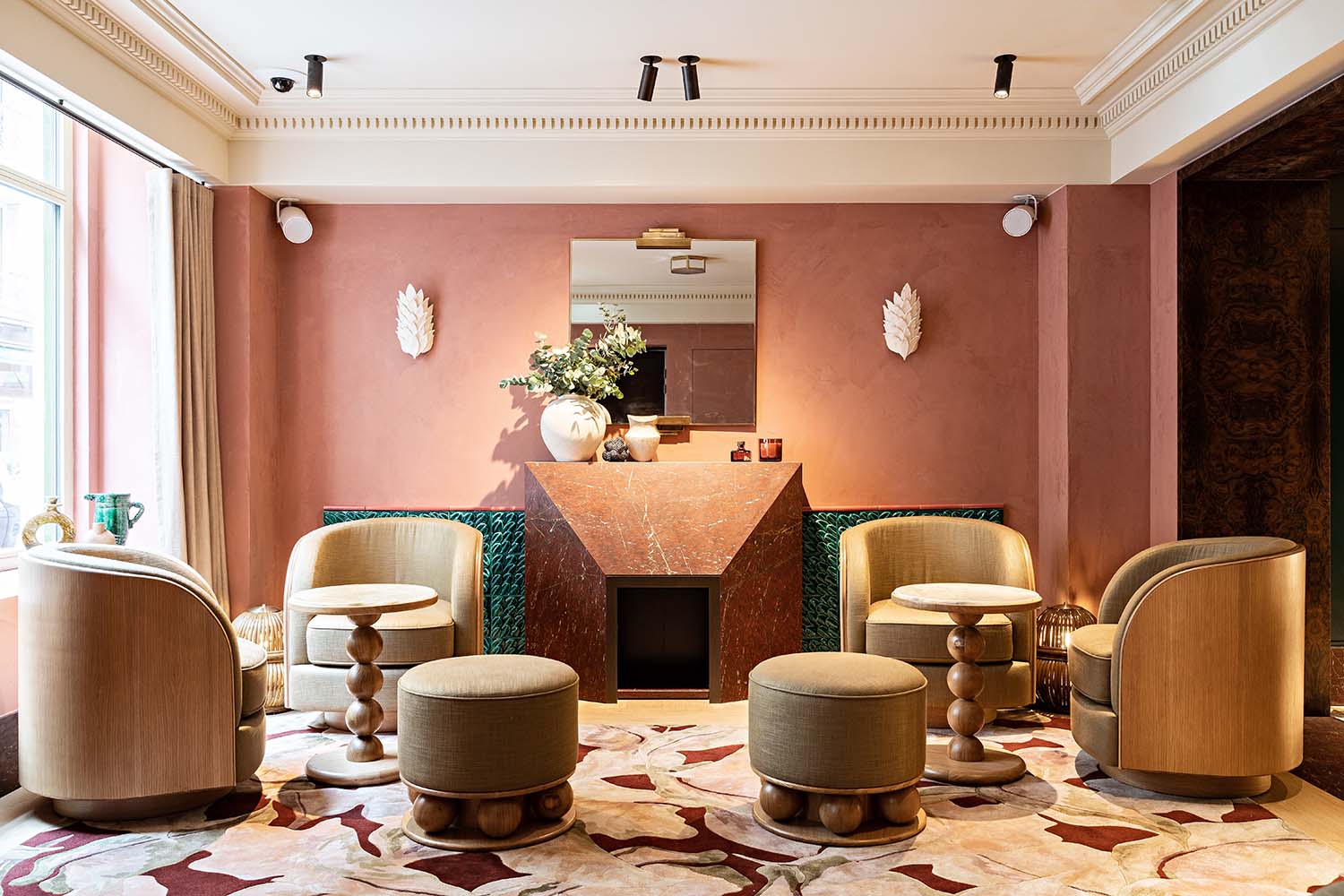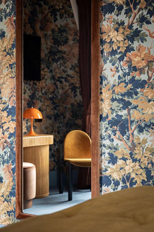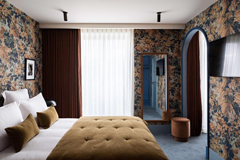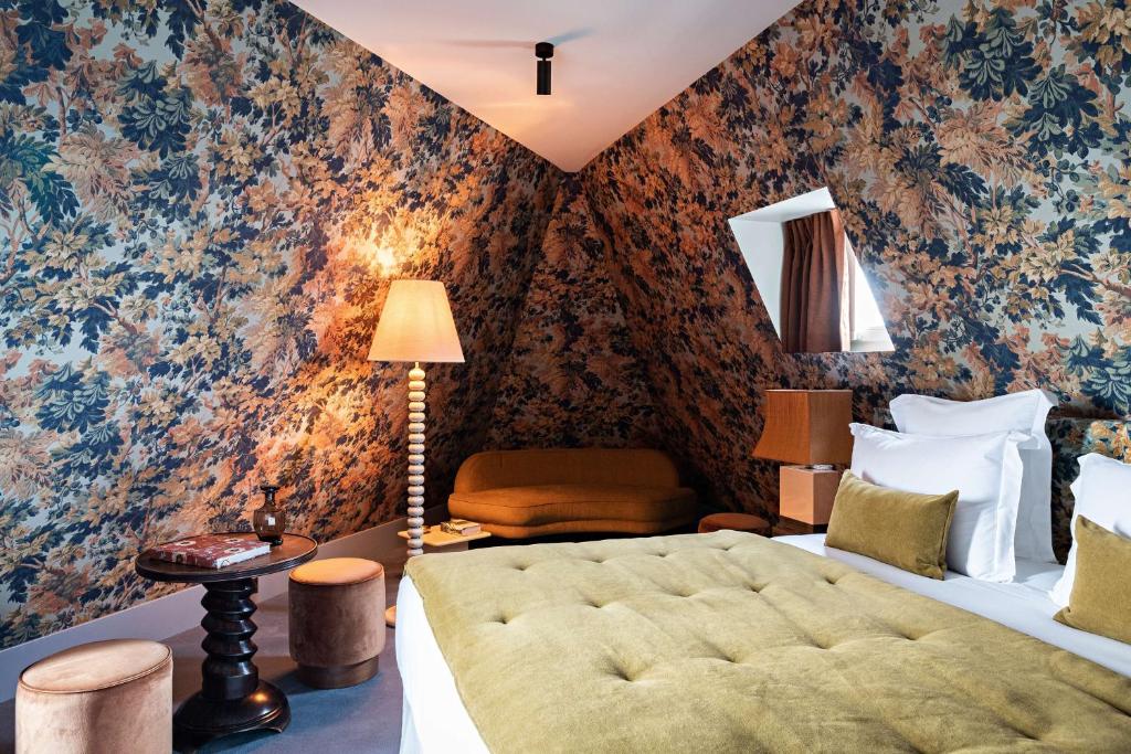 Inside, brass accents, tropical motifs, and geometric patterns dance among marble and burr wood, nodding to its Art Deco heritage. But this isn’t a simple tribute to the past—Hôtel Florida is a vibrant, eclectic fusion of eras. Picture a chic family home, inhabited by a delightfully eccentric fashionista aunt, where cozy attic rooms on the sixth and seventh floors bloom with floral wallpapers, antique furnishings, and dreamy shades of blue, wrapped in a wistful air of nostalgia.