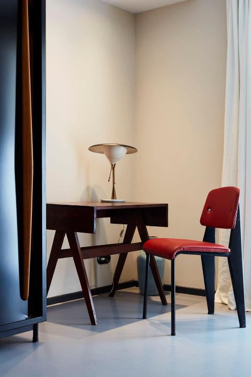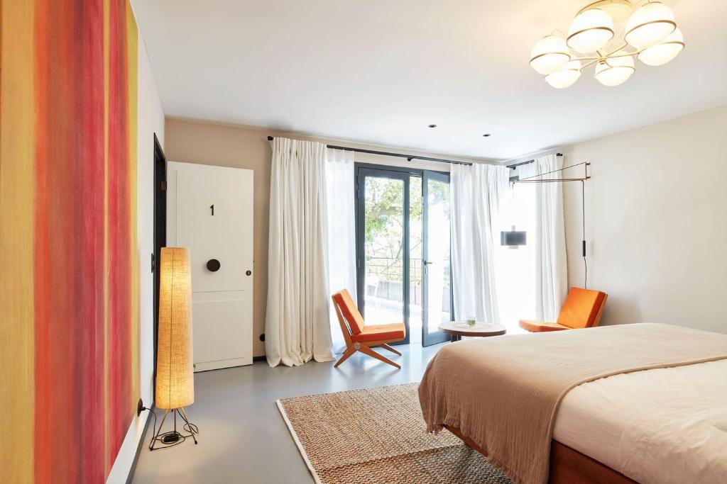 French architect Charles Zana led the renovation, adding a travertine reception desk, a curated bookshop-boutique, and sleek social spaces, including a chic restaurant and lounge. Here, Richard Long’s minimalist white stone circle graces the garden, setting the tone for an immersive art experience. Four guest rooms echo the same ethos, adorned with mid-century treasures like Charlotte Perriand tables, Jean Prouvé chairs, Alvar Aalto lamps, and Le Corbusier headboards that double as storage and space dividers.