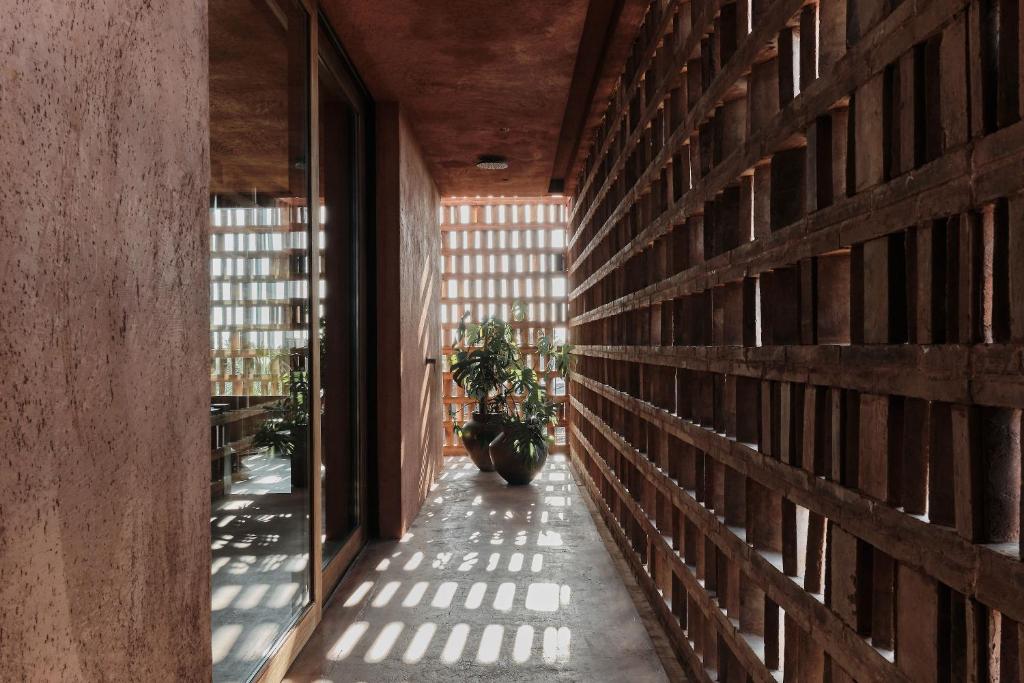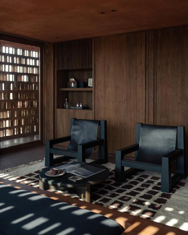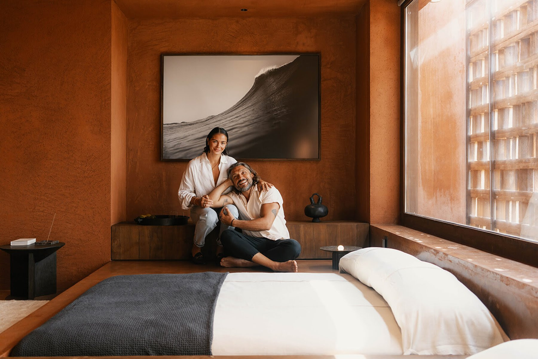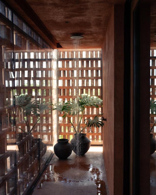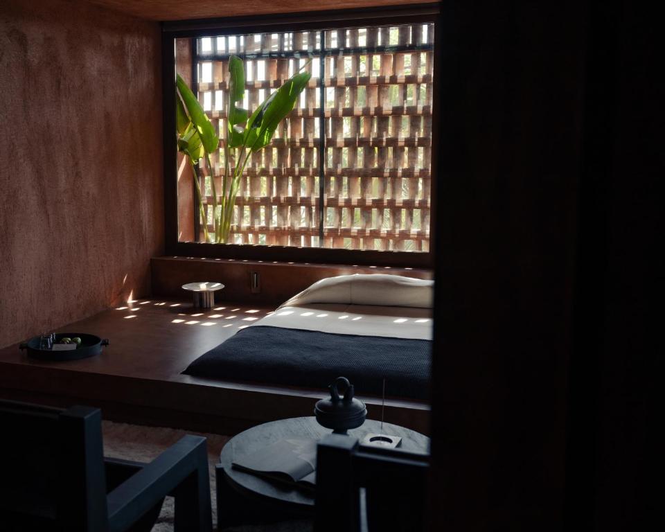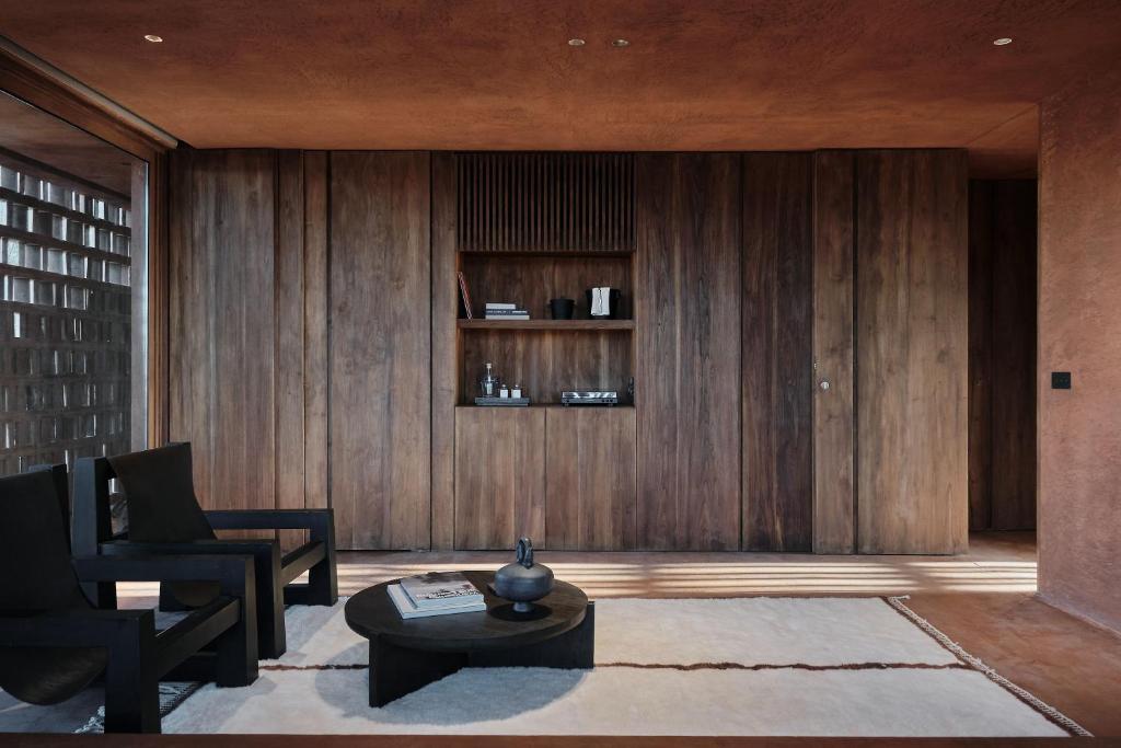 Created by Italian architecture firm MORQ and Australian design studio Studio Wenden, the rooms draw deeply from Balinese textures and forms. Burnt-sienna plaster walls, patterned brickwork that filters the morning sun and semi-open showers that wrap around the bedroom strike a balance between sculptural design and tropical ease. Cast-iron furniture, travertine and timber ground the spaces, complemented by sultry black-and-white photography and custom amenities crafted in collaboration with Oaken Lab.