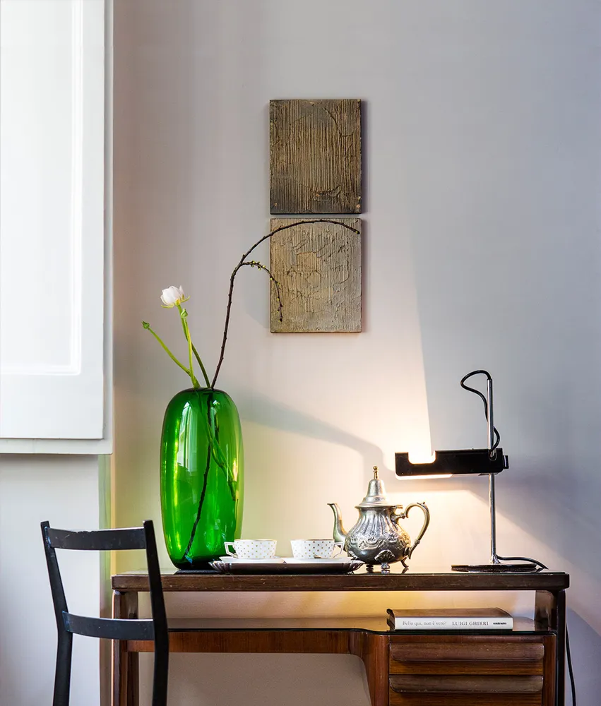 Each of the ten suites is named after a 20th-century Italian design icon—think Gio Ponti, Guglielmo Ulrich, or Ico Parisi—with original vintage pieces punctuating the space. But this isn’t a museum. Interiors blend bohemian elegance with radical restraint: velvet armchairs, sculptural light fittings, brass accents, and freestanding clawfoot tubs, all framed by a moody palette of taupe, charcoal, and gold. Bathrooms, some hidden behind heavy velvet curtains or mirrored panels, play with voyeurism and intimacy. The lighting is sultry, the proportions dramatic, and the vibe distinctly cinematic.